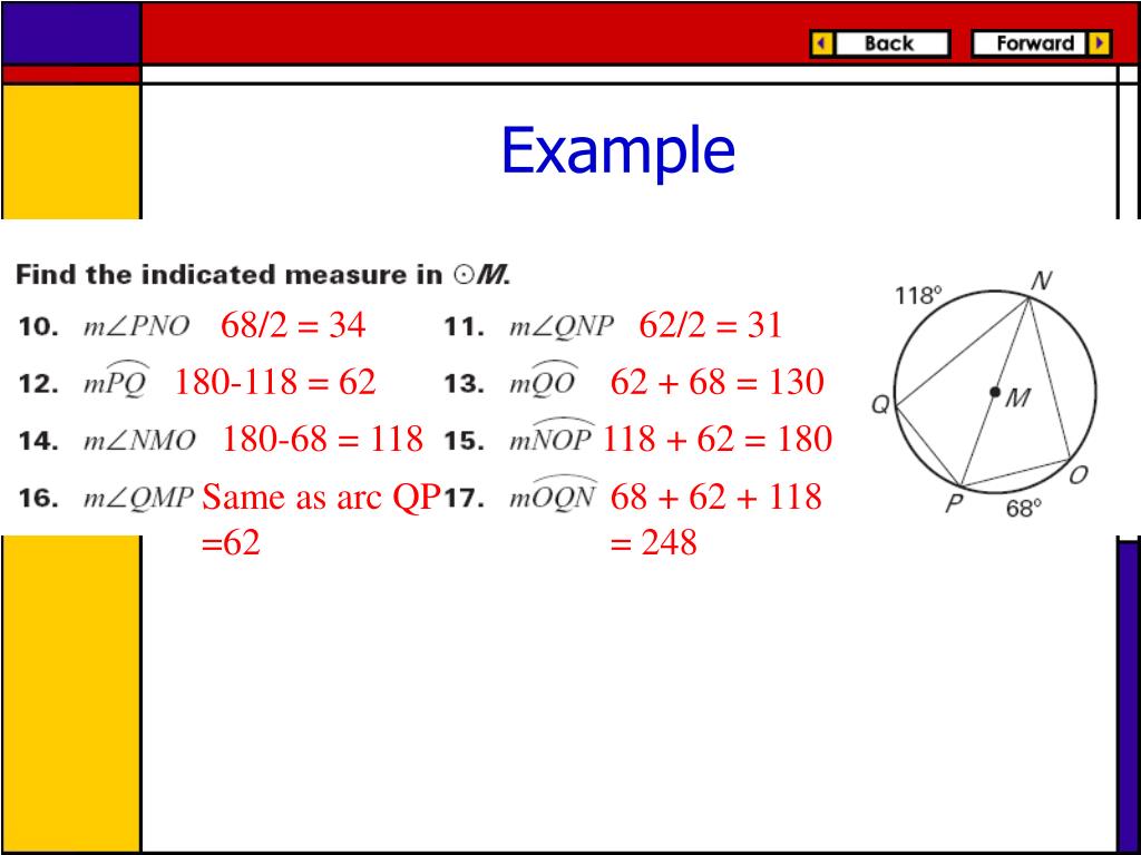 Example 68/2 = 34 62/2 = 31 180-118 = 62 62 + 68 = 130 180-68 = 118 118 + 62 = 180 Same as arc QP =62 68 + 62 + 118 = 248