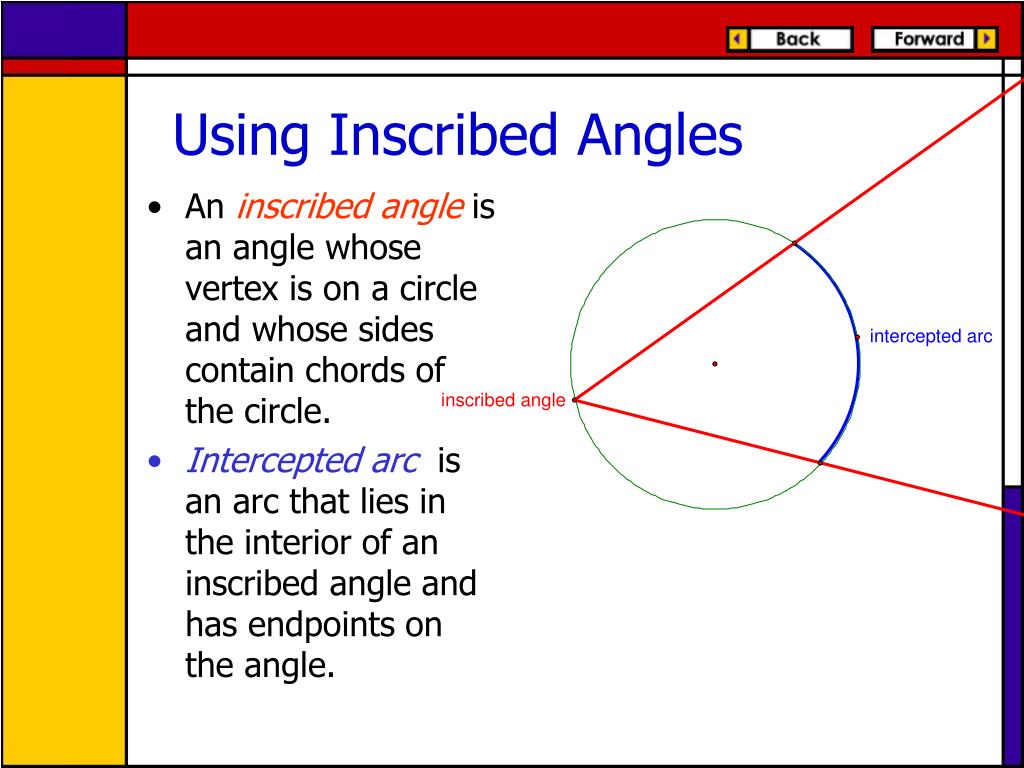 An inscribed angle is an angle whose vertex is on a circle and whose sides contain chords of the circle. Intercepted arc is an arc that lies in the interior of an inscribed angle and has endpoints on the angle. Using Inscribed Angles