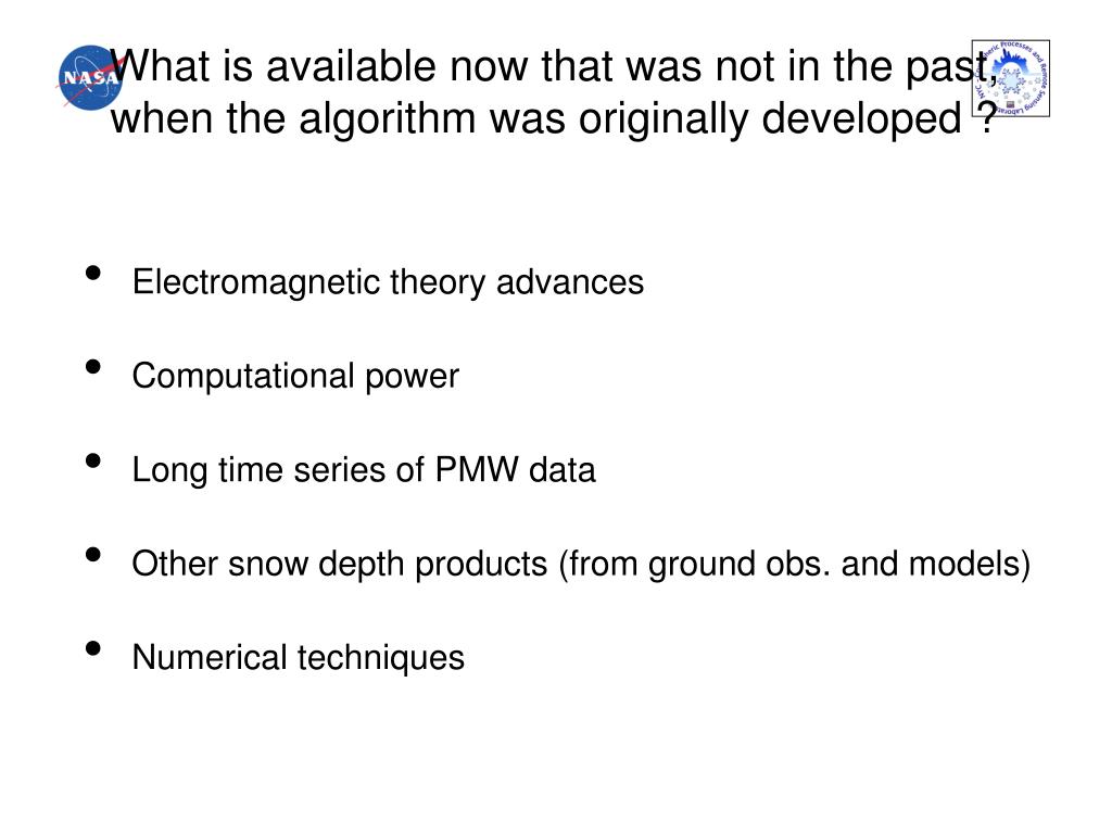 What is available now that was not in the past, when the algorithm was originally developed ? • Electromagnetic theory advances • Computational power • Long time series of PMW data • Other snow depth products (from ground obs. and models) • Numerical techniques