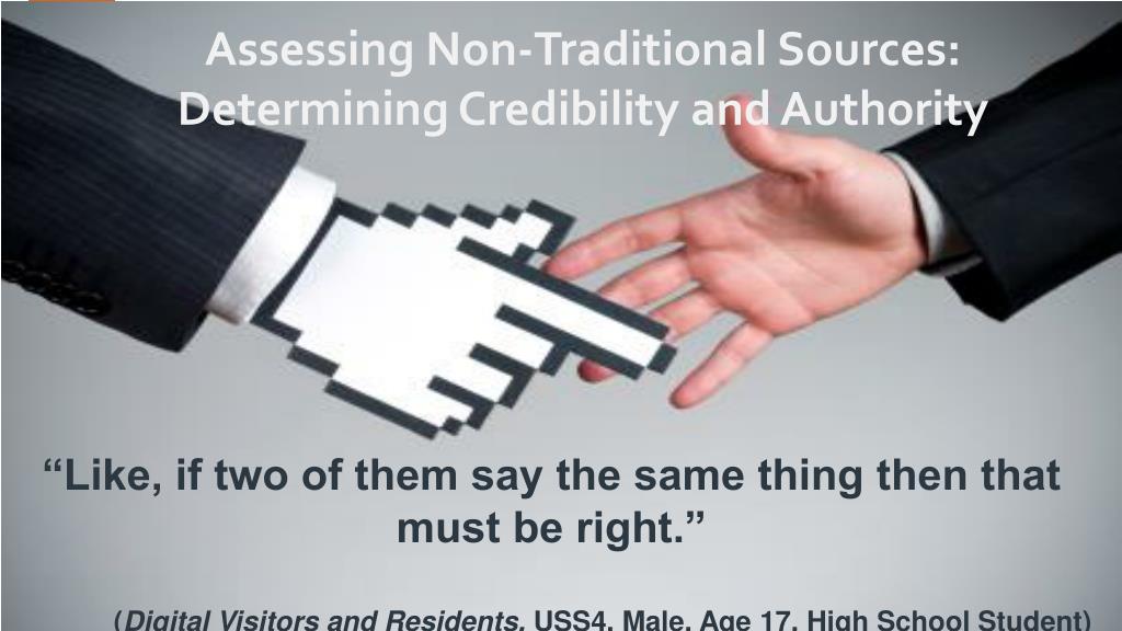 Assessing Non-Traditional Sources: Determining Credibility and Authority “Like, if two of them say the same thing then that must be right.” (Digital Visitors and Residents, USS4, Male, Age 17, High School Student)