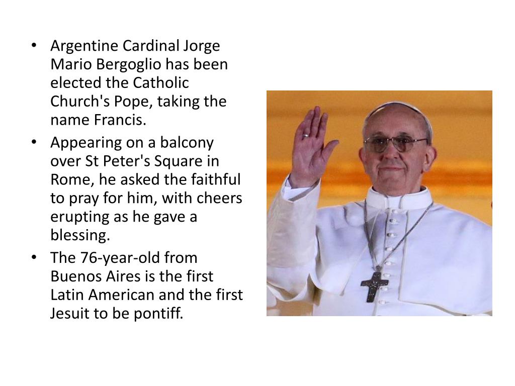 Argentine Cardinal Jorge Mario Bergoglio has been elected the Catholic Church's Pope, taking the name Francis. • Appearing on a balcony over St Peter's Square in Rome, he asked the faithful to pray for him, with cheers erupting as he gave a blessing. • The 76-year-old from Buenos Aires is the first Latin American and the first Jesuit to be pontiff.