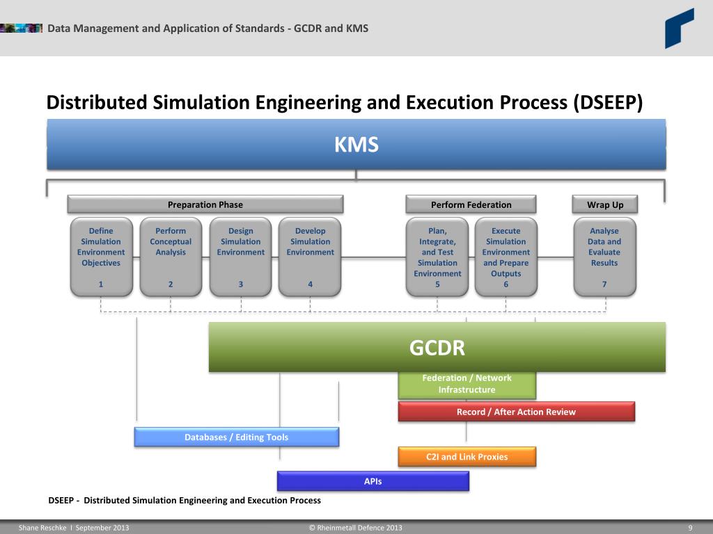 Distributed Simulation Engineering and Execution Process (DSEEP) KMS Management Tools Collaboration Tools Preparation Phase Perform Federation Wrap Up ExecuteSimulationEnvironmentand PrepareOutputs 6 AnalyseData andEvaluateResults 7 DefineSimulationEnvironment Objectives 1 PerformConceptualAnalysis 2 Design Simulation Environment 3 Develop Simulation Environment 4 Plan,Integrate,and TestSimulationEnvironment 5 GCDR FederationControl Tools Synthtic Environment Services Federation / Network Infrastructure Record / After Action Review Databases / Editing Tools C2I and Link Proxies APIs DSEEP -Distributed Simulation Engineering and Execution Process