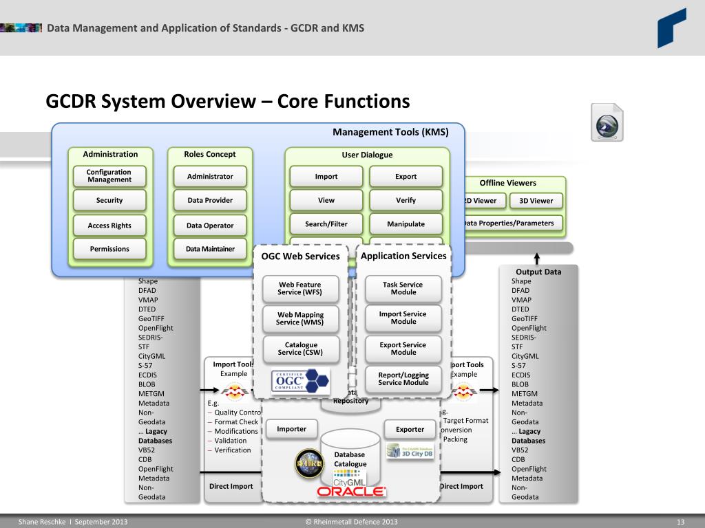 GCDR System Overview – Core Functions Management Tools (KMS) Management Tools (KMS) Administration Administration RolesConcept RolesConcept User Dialogue User Dialogue Export Export ConfigurationManagement ConfigurationManagement Administrator Administrator Import Import Export Export Verify Verify Security Security Data Provider Data Provider View View Verify Verify Offline Viewers Manipulate Manipulate Search/Filter Search/Filter Manipulate Manipulate Access Rights Access Rights Data Operator Data Operator 2D Viewer 3D Viewer 3D Viewer 3D Viewer 2D Viewer 2D Viewer 3D Viewer 3D Viewer Permissions Permissions Data Maintainer Data Maintainer Data Properties/Parameters Network Application Services Application Services OGC Web Services OGC Web Services Input Data Output Data Shape DFAD VMAP DTED GeoTIFF OpenFlight SEDRIS- STF CityGML S-57 ECDIS BLOB METGM Metadata Non- Geodata … Lagacy Databases VB52 CDB OpenFlight Metadata Non-Geodata Shape DFAD VMAP DTED GeoTIFF OpenFlight SEDRIS- STF CityGML S-57 ECDIS BLOB METGM Metadata Non- Geodata … Lagacy Databases VB52 CDB OpenFlight Metadata Non-Geodata Export Export Web Feature Service (WFS) Web Feature Service (WFS) Task Service Module Task Service Module Verify Verify Import Service Module Import Service Module Web MappingService (WMS) Web MappingService (WMS) Manipulate Manipulate CatalogueService (CSW) CatalogueService (CSW) Export Service Module Export Service Module 3D Viewer 3D Viewer Report/LoggingService Module Report/LoggingService Module Import Tools Example Export Tools Example Data Repository Data Repository • E.g. • Quality Control • Format Check • Modifications • Validation • Verification • E.g. • Target Format • Conversion • Packing Importer Importer Exporter Exporter Database Catalogue Database Catalogue Direct Import Direct Import