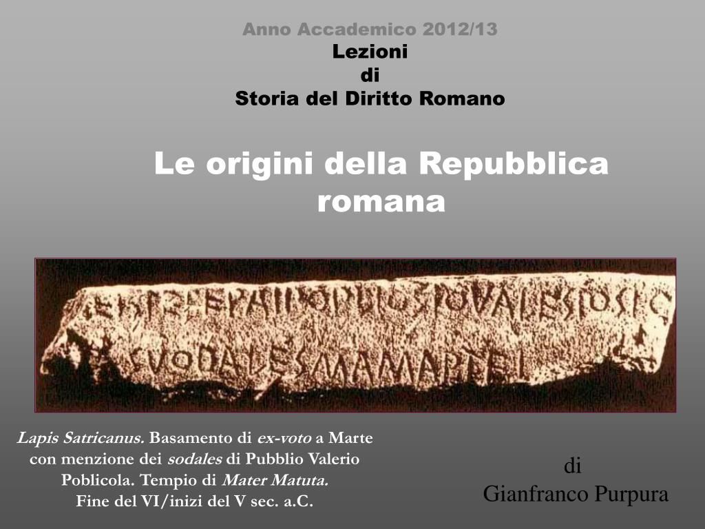 Anno Accademico 2012/13 Lezioni di Storia del Diritto Romano Le origini della Repubblica romana Lapis Satricanus. Basamento di ex-voto a Marte con menzione dei sodales di Pubblio Valerio Poblicola. Tempio di Mater Matuta. Fine del VI/inizi del V sec. a.C. di Gianfranco Purpura