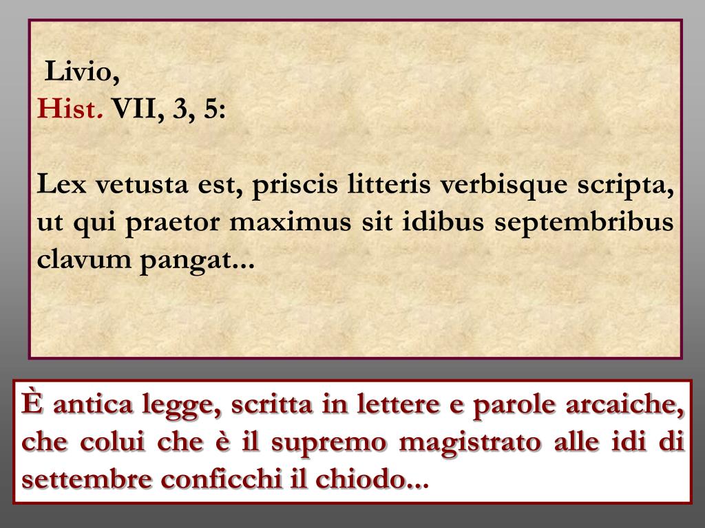 Livio, Hist. VII, 3, 5: Lex vetusta est, priscis litteris verbisque scripta, ut qui praetor maximus sit idibus septembribus clavum pangat... È antica legge, scritta in lettere e parole arcaiche, che colui che è il supremo magistrato alle idi di settembre conficchi il chiodo...