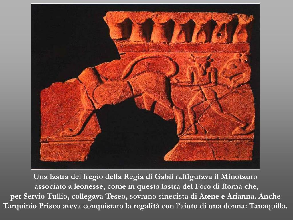 Una lastra del fregio della Regia di Gabii raffigurava il Minotauro associato a leonesse, come in questa lastra del Foro di Roma che, per Servio Tullio, collegava Teseo, sovrano sinecista di Atene e Arianna. Anche Tarquinio Prisco aveva conquistato la regalità con l’aiuto di una donna: Tanaquilla.