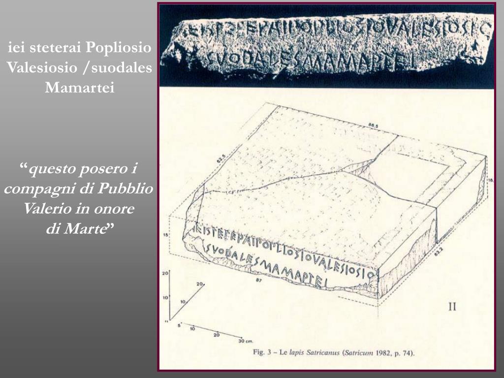 iei steterai Popliosio Valesiosio /suodales Mamartei “questo posero i compagni di Pubblio Valerio in onore di Marte”