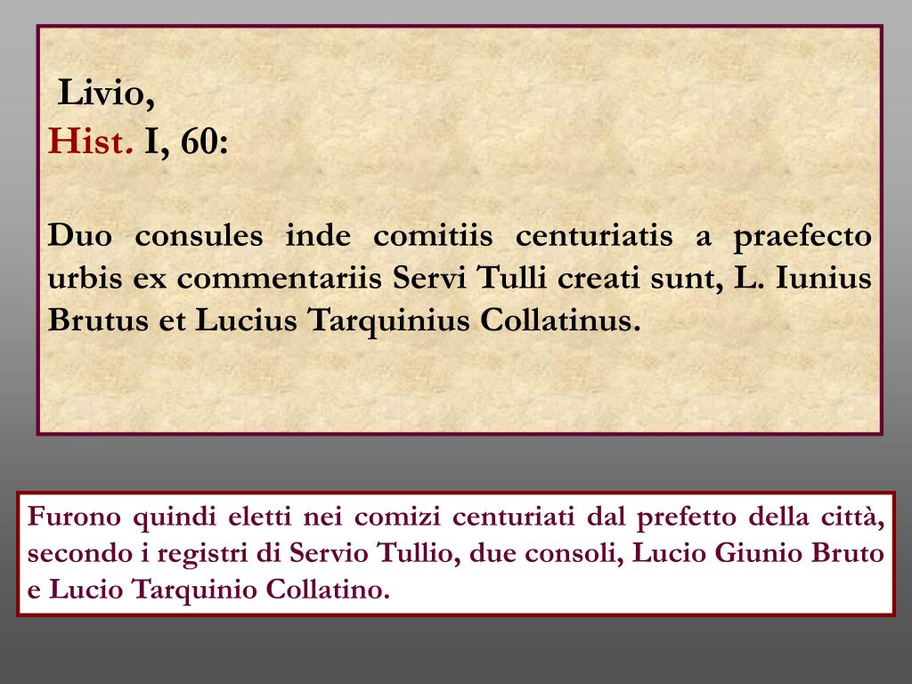 Livio, Hist. I, 60: Duo consules inde comitiis centuriatis a praefecto urbis ex commentariis Servi Tulli creati sunt, L. Iunius Brutus et Lucius Tarquinius Collatinus. Furono quindi eletti nei comizi centuriati dal prefetto della città, secondo i registri di Servio Tullio, due consoli, Lucio Giunio Bruto e Lucio Tarquinio Collatino.
