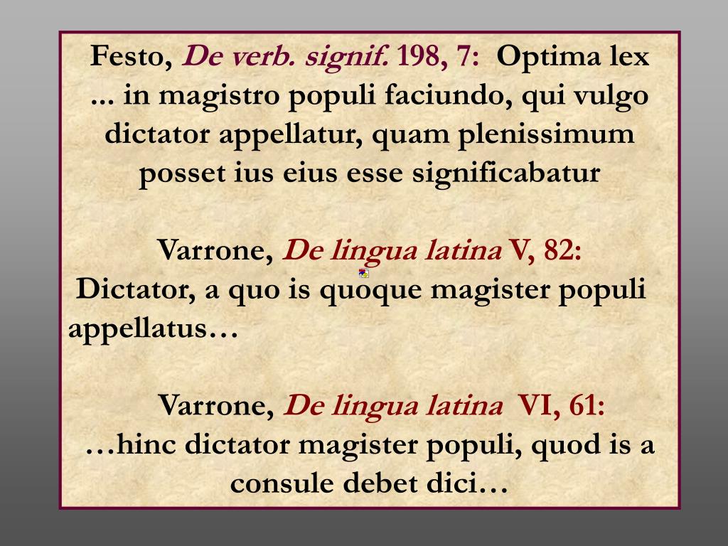 Festo, De verb. signif. 198, 7:Optima lex ... in magistro populi faciundo, qui vulgo dictator appellatur, quam plenissimum posset ius eius esse significabatur Varrone, De lingua latina V, 82: Dictator, a quo is quoque magister populi appellatus… Varrone, De lingua latinaVI, 61: …hinc dictator magister populi, quod is a consule debet dici…