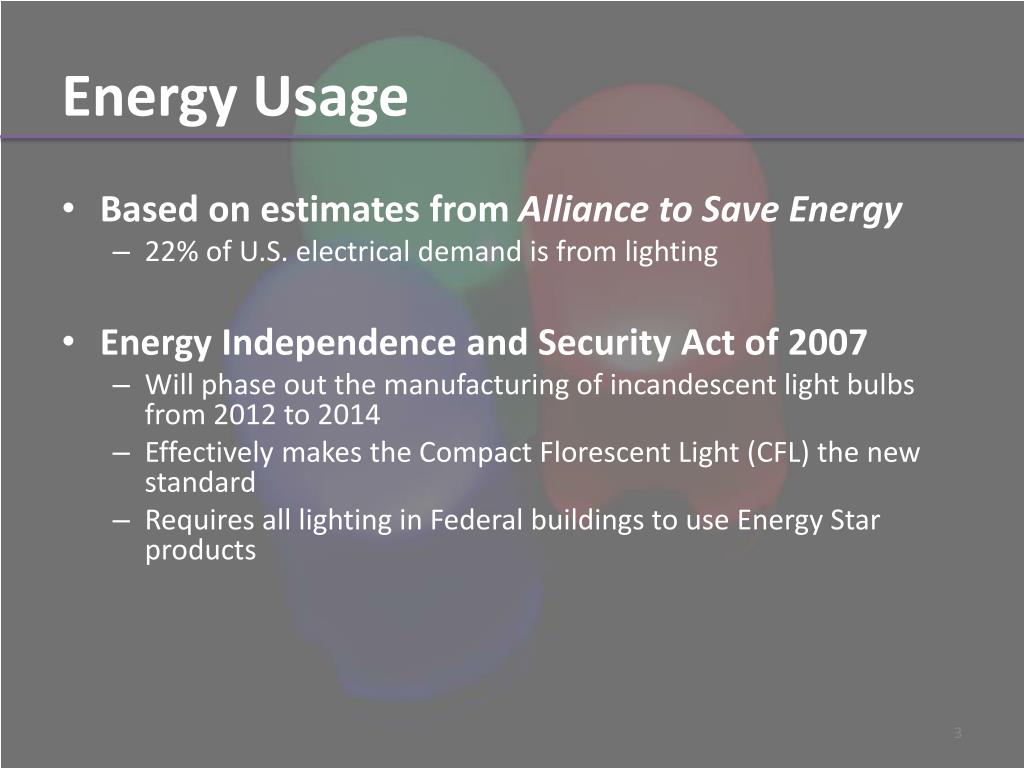 Energy Usage Based on estimates from Alliance to Save Energy 22% of U.S. electrical demand is from lighting Energy Independence and Security Act of 2007 Will phase out the manufacturing of incandescent light bulbs from 2012 to 2014 Effectively makes the Compact Florescent Light (CFL) the new standard Requires all lighting in Federal buildings to use Energy Star products