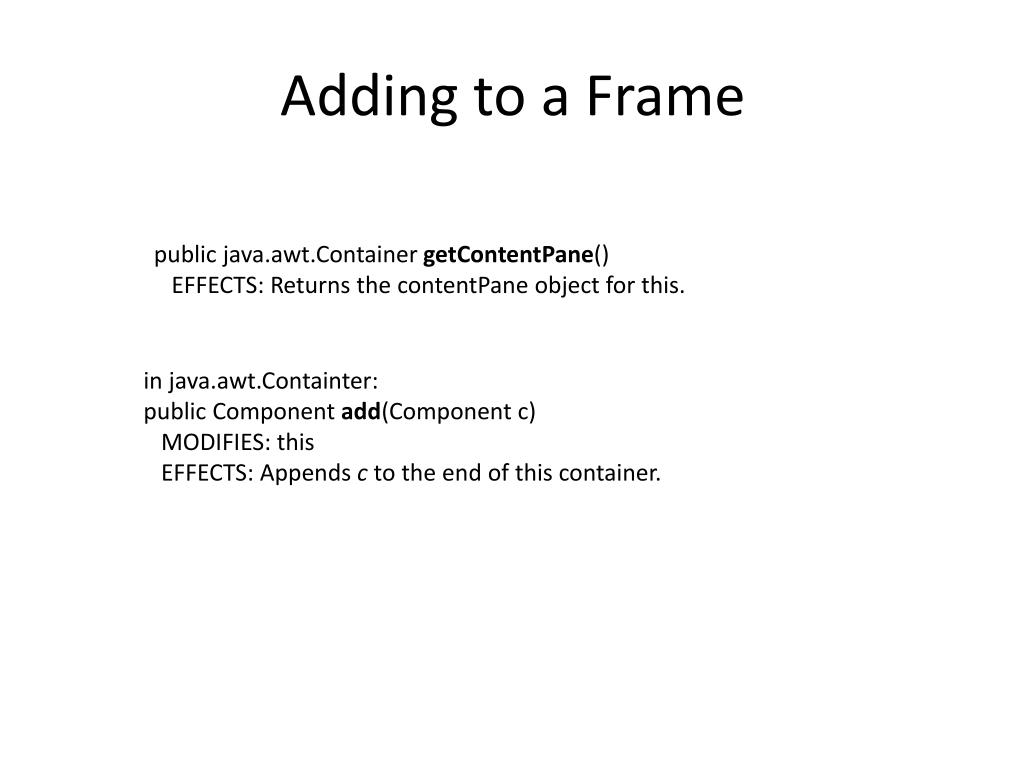 Adding to a Frame public java.awt.ContainergetContentPane() EFFECTS: Returns the contentPaneobject for this. in java.awt.Containter: public Component add(Component c) MODIFIES: this EFFECTS: Appends c to the end of this container.