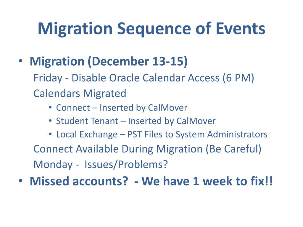 Migration Sequence of Events • Migration (December 13-15) • Friday - Disable Oracle Calendar Access (6 PM) • Calendars Migrated • Connect – Inserted by CalMover • Student Tenant – Inserted by CalMover • Local Exchange – PST Files to System Administrators • Connect Available During Migration (Be Careful) • Monday - Issues/Problems? • Missed accounts? - We have 1 week to fix!!