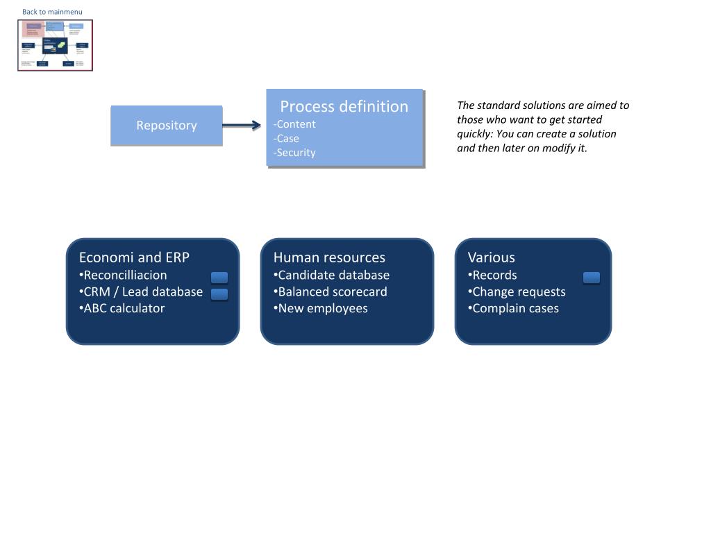 Process definition • Content • Case • Security The standard solutions are aimed to those who want to get started quickly: You can create a solution and then later on modify it. Repository • Economi and ERP • Reconcilliacion • CRM / Lead database • ABC calculator • Human resources • Candidate database • Balanced scorecard • New employees • Various • Records • Change requests • Complain cases