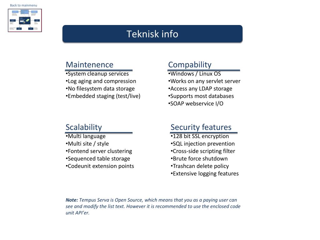 Teknisk info • Maintenence • System cleanup services • Log aging and compression • No filesystem data storage • Embedded staging (test/live) • Compability • Windows / Linux OS • Works on any servlet server • Access any LDAP storage • Supports most databases • SOAP webservice I/O • Scalability • Multi language • Multi site / style • Fontend server clustering • Sequenced table storage • Codeunit extension points • Security features • 128 bit SSL encryption • SQL injection prevention • Cross-side scripting filter • Brute force shutdown • Trashcan delete policy • Extensive logging features Note: Tempus Serva is Open Source, which means that you as a paying user can see and modify the list text. However it is recommended to use the enclosed code unit API’er.