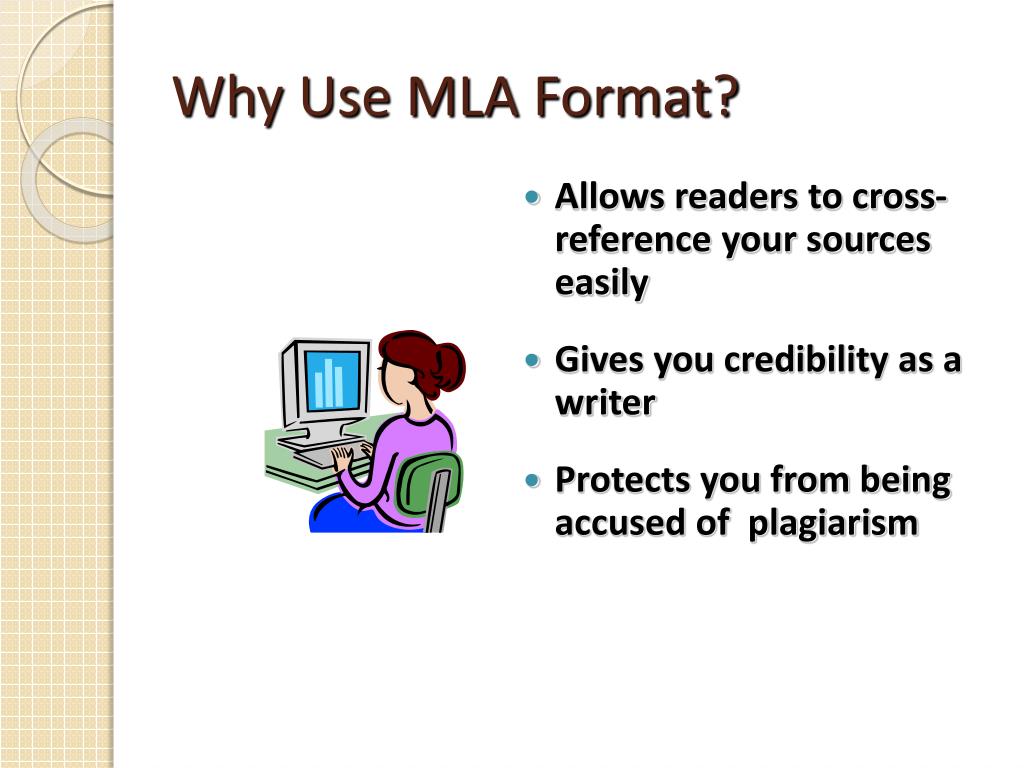 Why Use MLA Format? • Allows readers to cross-reference your sources easily • Gives you credibility as a writer • Protects you from being accused of plagiarism