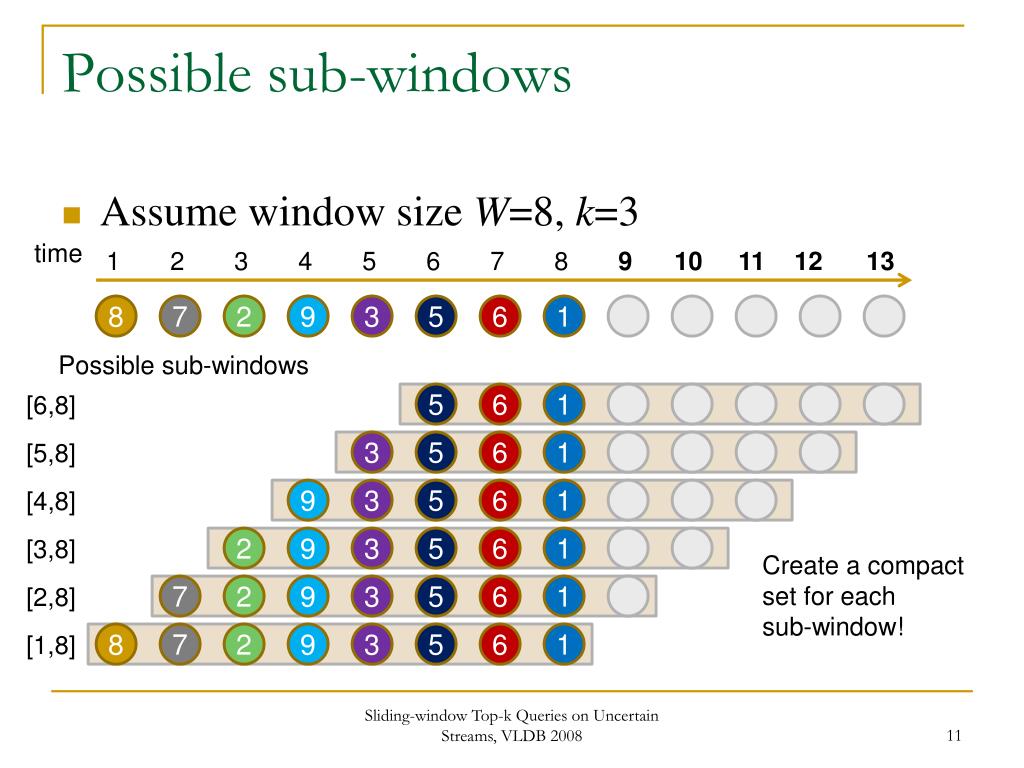 Possible sub-windows • Assume window size W=8, k=3 time 1 2 3 4 5 6 7 8 9 10 11 12 13 8 7 2 9 3 5 6 1 Possible sub-windows 8 7 2 9 3 5 6 1 [1,8] [2,8] 7 2 9 3 5 6 1 2 9 3 5 6 1 [3,8] 9 3 5 6 1 [4,8] Create a compact set for each sub-window! 3 5 6 1 [5,8] 5 6 1 [6,8] Sliding-window Top-k Queries on Uncertain Streams, VLDB 2008