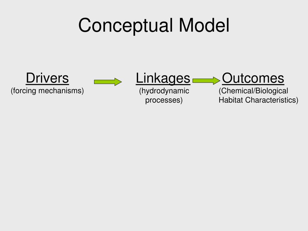 Conceptual Model Drivers (forcing mechanisms) Linkages (hydrodynamic processes) Outcomes (Chemical/Biological Habitat Characteristics)
