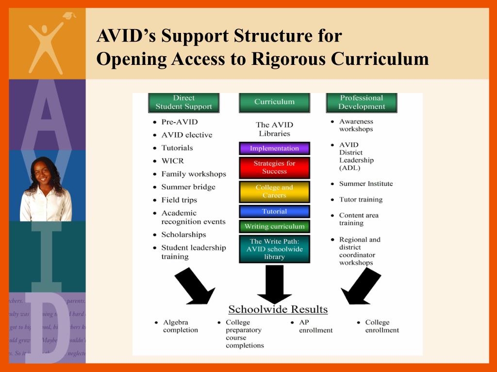 Why AVID Works Places AVID students in rigorous curriculum and gives them the support to achieve; Provides the explicit “hidden curriculum” of schools; Provides a team of students for positive peer identification; and Redefines teacher’s role as that of student advocate.