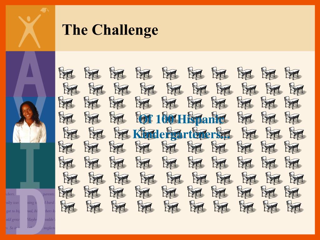 AVID Graduates • 96% plan to enroll in a college or university • 68% plan to enroll in a four-year university • 28% plan to enroll in a two-year college • 83% of parents have less than a four-year collegedegree Source: AVID Center Data Collection System, 2003-2004 Percentages have been rounded to the nearest whole percent