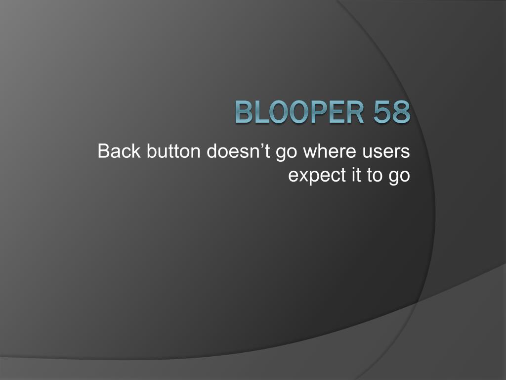 Blooper 58 • Problem: • Confuses the user (like with frames) • Will form data be saved when going back? • Solution: • Do what your best to make the back button do what users expect. • Avoid problem areas.