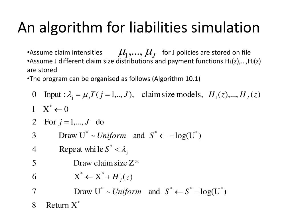 An algorithm for liabilitiessimulation • Assumeclaimintensities for J policiesarestoredon file • Assume J differentclaimsizedistributions and paymentfunctions H1(z),…,HJ(z) arestored • The program can be organised as follows (Algorithm 10.1)