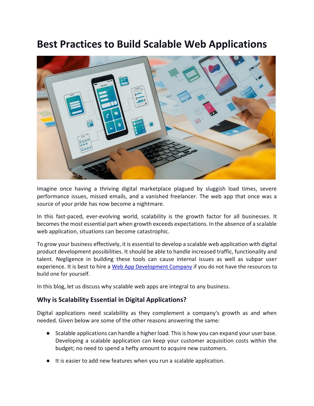 Best Practices to Build Scalable Web Applications Imagine once having a thriving digital marketplace plagued by sluggish load times, severe performance issues, missed emails, and a vanished freelancer. The web app that once was a source of your pride has now become a nightmare. In this fast-paced, ever-evolving world, scalability is the growth factor for all businesses. It becomes the most essential part when growth exceeds expectations. In the absence of a scalable web application, situations can become catastrophic. To grow your business effectively, it is essential to develop a scalable web application with digital product development possibilities. It should be able to handle increased traffic, functionality and talent. Negligence in building these tools can cause internal issues as well as subpar user experience. It is best to hire a Web App Development Company if you do not have the resources to build one for yourself. In this blog, let us discuss why scalable web apps are integral to any business. Why is Scalability Essential in Digital Applications? Digital applications need scalability as they complement a company's growth as and when needed. Given below are some of the other reasons answering the same: ●Scalable applications can handle a higher load. This is how you can expand your user base. Developing a scalable application can keep your customer acquisition costs within the budget; no need to spend a hefty amount to acquire new customers. ●It is easier to add new features when you run a scalable application.