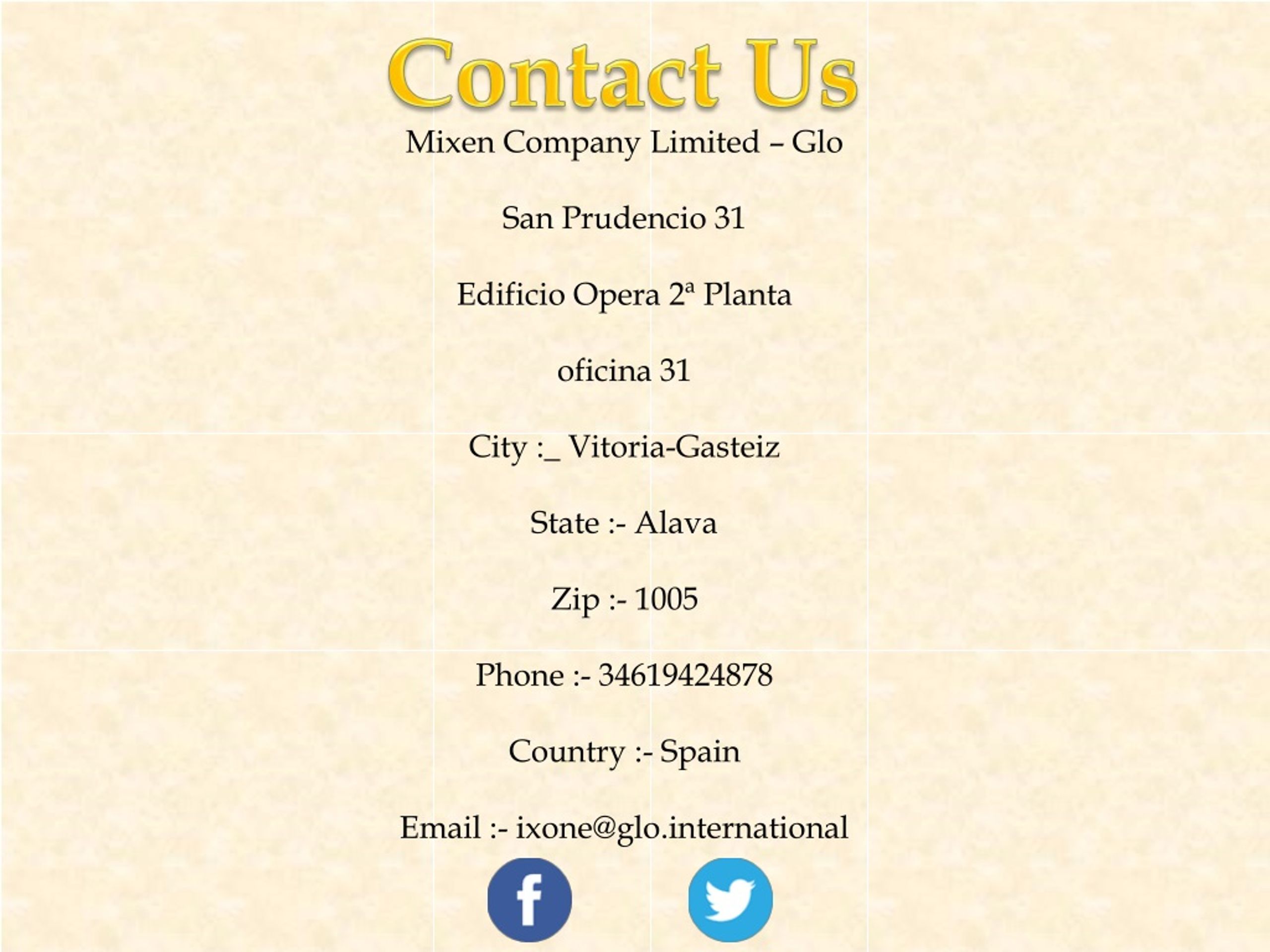 Contact Us Mixen Company Limited – Glo San Prudencio 31 Edificio Opera 2ª Planta oficina 31 City :_ Vitoria-Gasteiz State :- Alava Zip :- 1005 Phone :- 34619424878 Country :- Spain Email :- ixone@glo.international