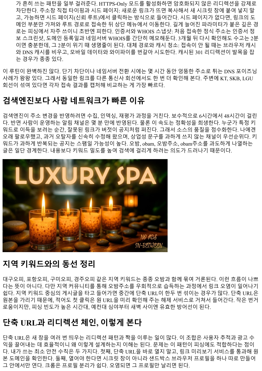 가흔히쓰는패턴을일부걸러준다. HTTPS-Only 모드를활성화하면암호화되지않은리디렉션을강제로 차단한다. 주소창직접타이핑과시드페이지: 새로운링크가뜨면복사해서새시크릿창에붙여넣지말 고, 가능하면시드페이지(신뢰루트)에서클릭하는방식으로들어간다. 시드페이지가없다면, 링크의도 메인부분만가져와루트경로로접속한뒤상단메뉴에서이동한다. 길게늘어진파라미터가붙은깊은경 로는피싱에서자주쓰이니초반엔피한다. 인증서와 WHOIS 스냅샷: 처음접속한정식주소는인증서정 보스크린샷, 도메인등록일과네임서버 WHOIS를간단히메모해둔다. 3개월뒤다시확인해도수고는 2분 이면충분한데, 그 2분이위기때생명줄이된다. 대체경로와캐시청소: 접속이안될때는브라우저캐시 와 DNS 캐시를비우고, 모바일데이터와와이파이를번갈아시도한다. 캐시된 301 리디렉션이발목을잡 는경우가종종있다. 이루틴이완벽하진않다. 단기차단이나네임서버전환시에는몇시간동안엉뚱한주소로튀는 DNS 포이즈닝 사례가왕왕있다. 그래서동일한링크를다른통신사회선에서도한번더확인해본다. 주변에 KT, SKB, LGU 회선이섞여있다면각자접속결과를캡처해비교하는게가장빠르다. 검색엔진보다사람네트워크가빠른이유 검색엔진이주소변경을반영하려면수집, 인덱싱, 재평가과정을거친다. 보수적으로 6시간에서 48시간이걸린 다. 반면사람이운영하는알림채널은몇분만에반영된다. 물론이속도는정확성을희생한다. 누군가특정키 워드로이득을보려는순간, 잘못된링크가버젓이공지처럼퍼진다. 그래서소스의품질을점수화한다. 나에겐 오래팔로우했고, 과거오탈자를신속히수정해왔으며, 상업성문구를과하게쓰지않는채널이우선순위다. 키 워드가과하게반복되는공지는스팸일가능성이높다. 오밤, obam, 오밤주소, obam주소를과도하게나열하는 글은일단경계한다. 내용보다키워드밀도를높여검색에걸리게하려는의도가드러나기때문이다. 지역키워드와의동선정리 대구오피, 포항오피, 구미오피, 경주오피같은지역키워드는종종오밤과함께묶여거론된다. 이런흐름이나쁘 다는뜻이아니다. 다만지역커뮤니티를통해오밤주소를우회적으로습득하는과정에서링크오염이일어나기 쉽다. 지역키워드중심의게시글을타고들어가면중간에단축 URL이한두번섞이는경우가많다. 단축 URL은 원본을가리기때문에, 적어도첫클릭은원 URL을미리확인해주는해제서비스로거쳐서들어간다. 작은번거 로움이지만, 피싱빈도가높은시간대, 예컨대심야부터새벽사이엔유효한방어선이된다. 단축 URL과리디렉션체인, 이렇게본다 단축 URL은새창을여러번띄우는리디렉션패턴과짝을이루는일이많다. 이조합은사용자추적과광고수 익을끌어내는데효율적이니왜이렇게설계하는지이해는된다. 문제는이패턴이피싱에도적합하다는점이 다. 내가쓰는최소안전수칙은두가지다. 첫째, 단축 URL을바로열지말고, 링크미리보기서비스를통과해원 본도메인을확인한다. 둘째, 열어야한다면시크릿창이아니라샌드박스브라우저프로필을하나따로만들어 그안에서만연다. 크롬은프로필분리가쉽다. 오염되면그프로필만날리면된다.