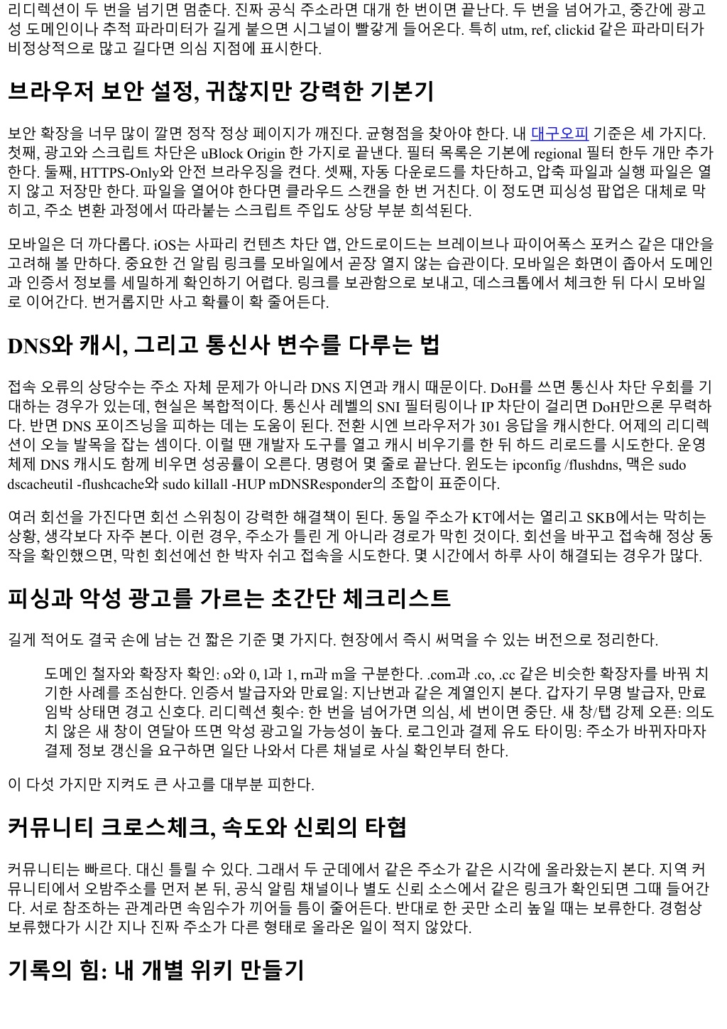 리디렉션이두번을넘기면멈춘다. 진짜공식주소라면대개한번이면끝난다. 두번을넘어가고, 중간에광고 성도메인이나추적파라미터가길게붙으면시그널이빨갛게들어온다. 특히 utm, ref, clickid 같은파라미터가 비정상적으로많고길다면의심지점에표시한다. 브라우저보안설정, 귀찮지만강력한기본기 보안확장을너무많이깔면정작정상페이지가깨진다. 균형점을찾아야한다. 내대구오피기준은세가지다. 첫째, 광고와스크립트차단은 uBlock Origin 한가지로끝낸다. 필터목록은기본에 regional 필터한두개만추가 한다. 둘째, HTTPS-Only와안전브라우징을켠다. 셋째, 자동다운로드를차단하고, 압축파일과실행파일은열 지않고저장만한다. 파일을열어야한다면클라우드스캔을한번거친다. 이정도면피싱성팝업은대체로막 히고, 주소변환과정에서따라붙는스크립트주입도상당부분희석된다. 모바일은더까다롭다. iOS는사파리컨텐츠차단앱, 안드로이드는브레이브나파이어폭스포커스같은대안을 고려해볼만하다. 중요한건알림링크를모바일에서곧장열지않는습관이다. 모바일은화면이좁아서도메인 과인증서정보를세밀하게확인하기어렵다. 링크를보관함으로보내고, 데스크톱에서체크한뒤다시모바일 로이어간다. 번거롭지만사고확률이확줄어든다. DNS와캐시, 그리고통신사변수를다루는법 접속오류의상당수는주소자체문제가아니라 DNS 지연과캐시때문이다. DoH를쓰면통신사차단우회를기 대하는경우가있는데, 현실은복합적이다. 통신사레벨의 SNI 필터링이나 IP 차단이걸리면 DoH만으론무력하 다. 반면 DNS 포이즈닝을피하는데는도움이된다. 전환시엔브라우저가 301 응답을캐시한다. 어제의리디렉 션이오늘발목을잡는셈이다. 이럴땐개발자도구를열고캐시비우기를한뒤하드리로드를시도한다. 운영 체제 DNS 캐시도함께비우면성공률이오른다. 명령어몇줄로끝난다. 윈도는 ipconfig /flushdns, 맥은 sudo dscacheutil -flushcache와 sudo killall -HUP mDNSResponder의조합이표준이다. 여러회선을가진다면회선스위칭이강력한해결책이된다. 동일주소가 KT에서는열리고 SKB에서는막히는 상황, 생각보다자주본다. 이런경우, 주소가틀린게아니라경로가막힌것이다. 회선을바꾸고접속해정상동 작을확인했으면, 막힌회선에선한박자쉬고접속을시도한다. 몇시간에서하루사이해결되는경우가많다. 피싱과악성광고를가르는초간단체크리스트 길게적어도결국손에남는건짧은기준몇가지다. 현장에서즉시써먹을수있는버전으로정리한다. 도메인철자와확장자확인: o와 0, l과 1, rn과 m을구분한다. .com과 .co, .cc 같은비슷한확장자를바꿔치 기한사례를조심한다. 인증서발급자와만료일: 지난번과같은계열인지본다. 갑자기무명발급자, 만료 임박상태면경고신호다. 리디렉션횟수: 한번을넘어가면의심, 세번이면중단. 새창/탭강제오픈: 의도 치않은새창이연달아뜨면악성광고일가능성이높다. 로그인과결제유도타이밍: 주소가바뀌자마자 결제정보갱신을요구하면일단나와서다른채널로사실확인부터한다. 이다섯가지만지켜도큰사고를대부분피한다. 커뮤니티크로스체크, 속도와신뢰의타협 커뮤니티는빠르다. 대신틀릴수있다. 그래서두군데에서같은주소가같은시각에올라왔는지본다. 지역커 뮤니티에서오밤주소를먼저본뒤, 공식알림채널이나별도신뢰소스에서같은링크가확인되면그때들어간 다. 서로참조하는관계라면속임수가끼어들틈이줄어든다. 반대로한곳만소리높일때는보류한다. 경험상 보류했다가시간지나진짜주소가다른형태로올라온일이적지않았다. 기록의힘: 내개별위키만들기