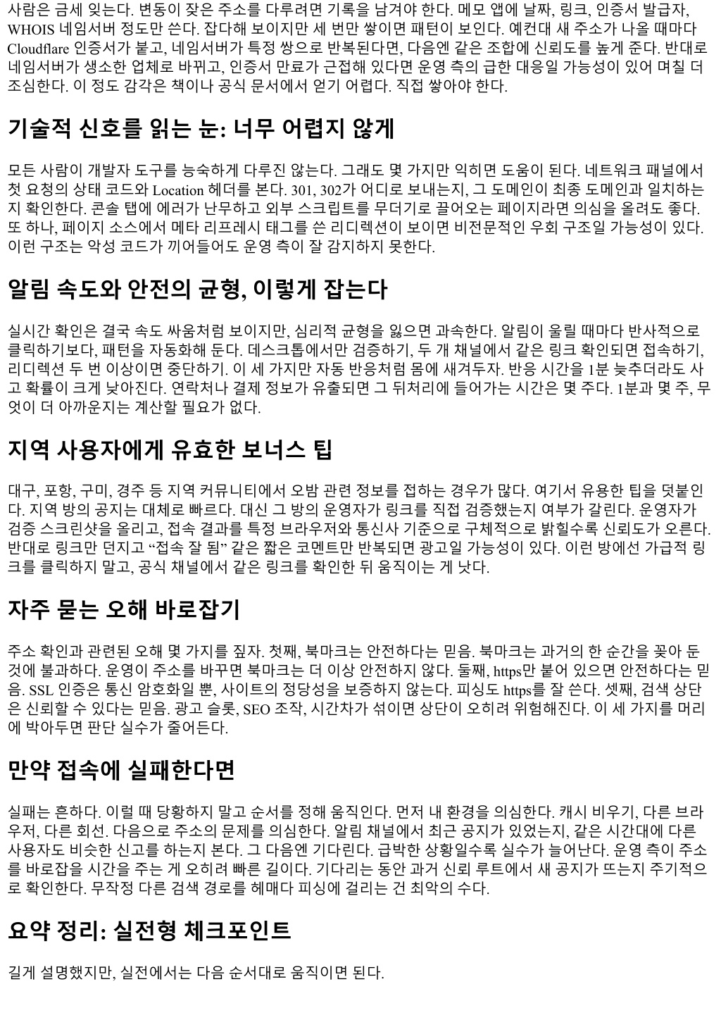 사람은금세잊는다. 변동이잦은주소를다루려면기록을남겨야한다. 메모앱에날짜, 링크, 인증서발급자, WHOIS 네임서버정도만쓴다. 잡다해보이지만세번만쌓이면패턴이보인다. 예컨대새주소가나올때마다 Cloudflare 인증서가붙고, 네임서버가특정쌍으로반복된다면, 다음엔같은조합에신뢰도를높게준다. 반대로 네임서버가생소한업체로바뀌고, 인증서만료가근접해있다면운영측의급한대응일가능성이있어며칠더 조심한다. 이정도감각은책이나공식문서에서얻기어렵다. 직접쌓아야한다. 기술적신호를읽는눈: 너무어렵지않게 모든사람이개발자도구를능숙하게다루진않는다. 그래도몇가지만익히면도움이된다. 네트워크패널에서 첫요청의상태코드와 Location 헤더를본다. 301, 302가어디로보내는지, 그도메인이최종도메인과일치하는 지확인한다. 콘솔탭에에러가난무하고외부스크립트를무더기로끌어오는페이지라면의심을올려도좋다. 또하나, 페이지소스에서메타리프레시태그를쓴리디렉션이보이면비전문적인우회구조일가능성이있다. 이런구조는악성코드가끼어들어도운영측이잘감지하지못한다. 알림속도와안전의균형, 이렇게잡는다 실시간확인은결국속도싸움처럼보이지만, 심리적균형을잃으면과속한다. 알림이울릴때마다반사적으로 클릭하기보다, 패턴을자동화해둔다. 데스크톱에서만검증하기, 두개채널에서같은링크확인되면접속하기, 리디렉션두번이상이면중단하기. 이세가지만자동반응처럼몸에새겨두자. 반응시간을 1분늦추더라도사 고확률이크게낮아진다. 연락처나결제정보가유출되면그뒤처리에들어가는시간은몇주다. 1분과몇주, 무 엇이더아까운지는계산할필요가없다. 지역사용자에게유효한보너스팁 대구, 포항, 구미, 경주등지역커뮤니티에서오밤관련정보를접하는경우가많다. 여기서유용한팁을덧붙인 다. 지역방의공지는대체로빠르다. 대신그방의운영자가링크를직접검증했는지여부가갈린다. 운영자가 검증스크린샷을올리고, 접속결과를특정브라우저와통신사기준으로구체적으로밝힐수록신뢰도가오른다. 반대로링크만던지고 “접속잘됨” 같은짧은코멘트만반복되면광고일가능성이있다. 이런방에선가급적링 크를클릭하지말고, 공식채널에서같은링크를확인한뒤움직이는게낫다. 자주묻는오해바로잡기 주소확인과관련된오해몇가지를짚자. 첫째, 북마크는안전하다는믿음. 북마크는과거의한순간을꽂아둔 것에불과하다. 운영이주소를바꾸면북마크는더이상안전하지않다. 둘째, https만붙어있으면안전하다는믿 음. SSL 인증은통신암호화일뿐, 사이트의정당성을보증하지않는다. 피싱도 https를잘쓴다. 셋째, 검색상단 은신뢰할수있다는믿음. 광고슬롯, SEO 조작, 시간차가섞이면상단이오히려위험해진다. 이세가지를머리 에박아두면판단실수가줄어든다. 만약접속에실패한다면 실패는흔하다. 이럴때당황하지말고순서를정해움직인다. 먼저내환경을의심한다. 캐시비우기, 다른브라 우저, 다른회선. 다음으로주소의문제를의심한다. 알림채널에서최근공지가있었는지, 같은시간대에다른 사용자도비슷한신고를하는지본다. 그다음엔기다린다. 급박한상황일수록실수가늘어난다. 운영측이주소 를바로잡을시간을주는게오히려빠른길이다. 기다리는동안과거신뢰루트에서새공지가뜨는지주기적으 로확인한다. 무작정다른검색경로를헤매다피싱에걸리는건최악의수다. 요약정리: 실전형체크포인트 길게설명했지만, 실전에서는다음순서대로움직이면된다.
