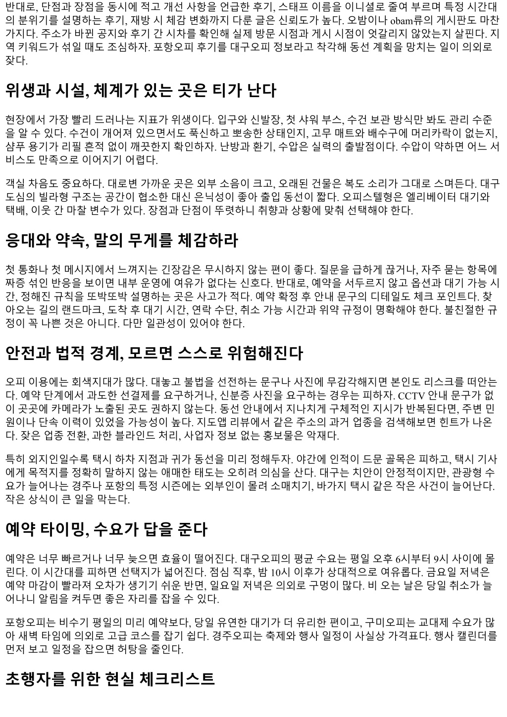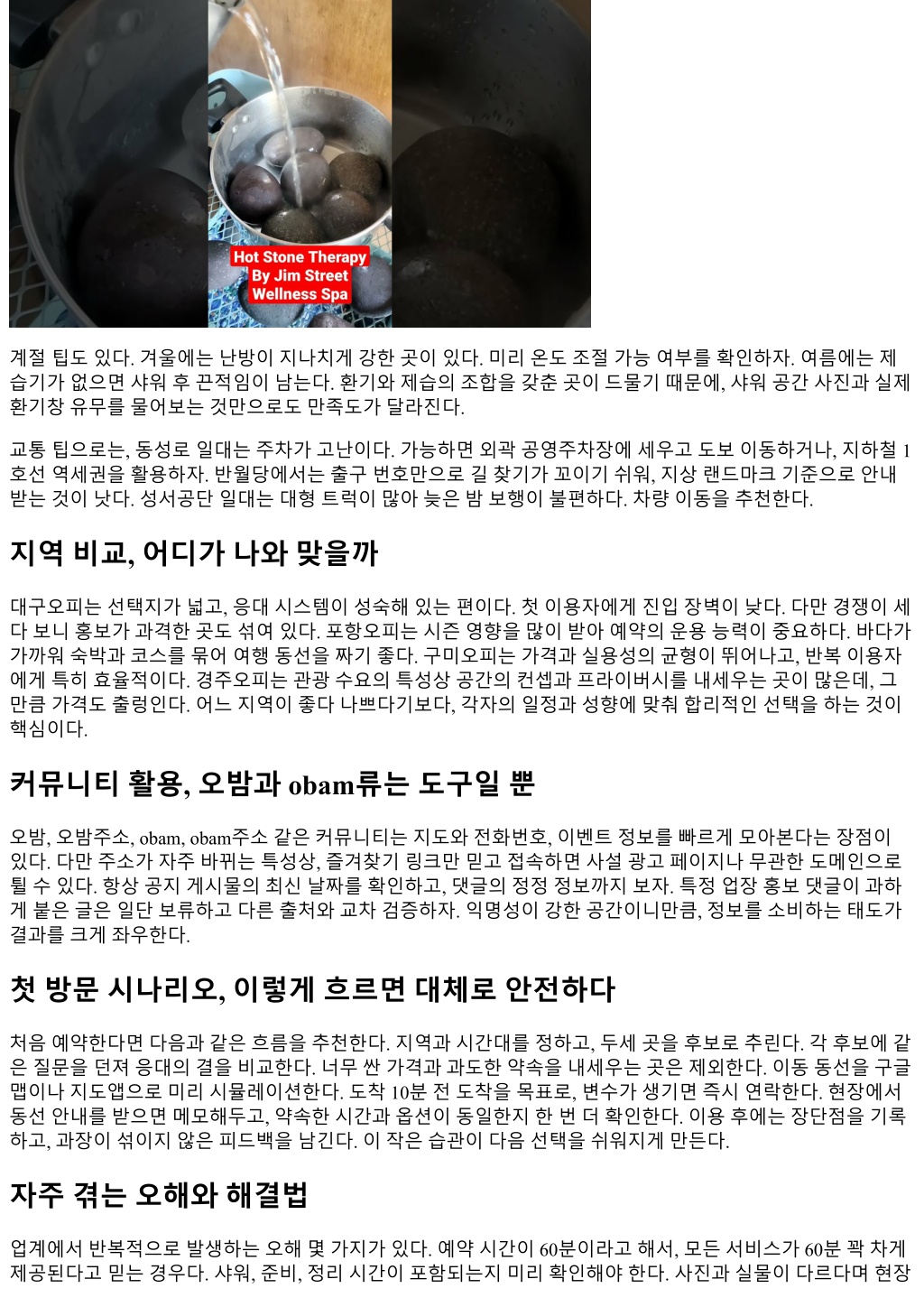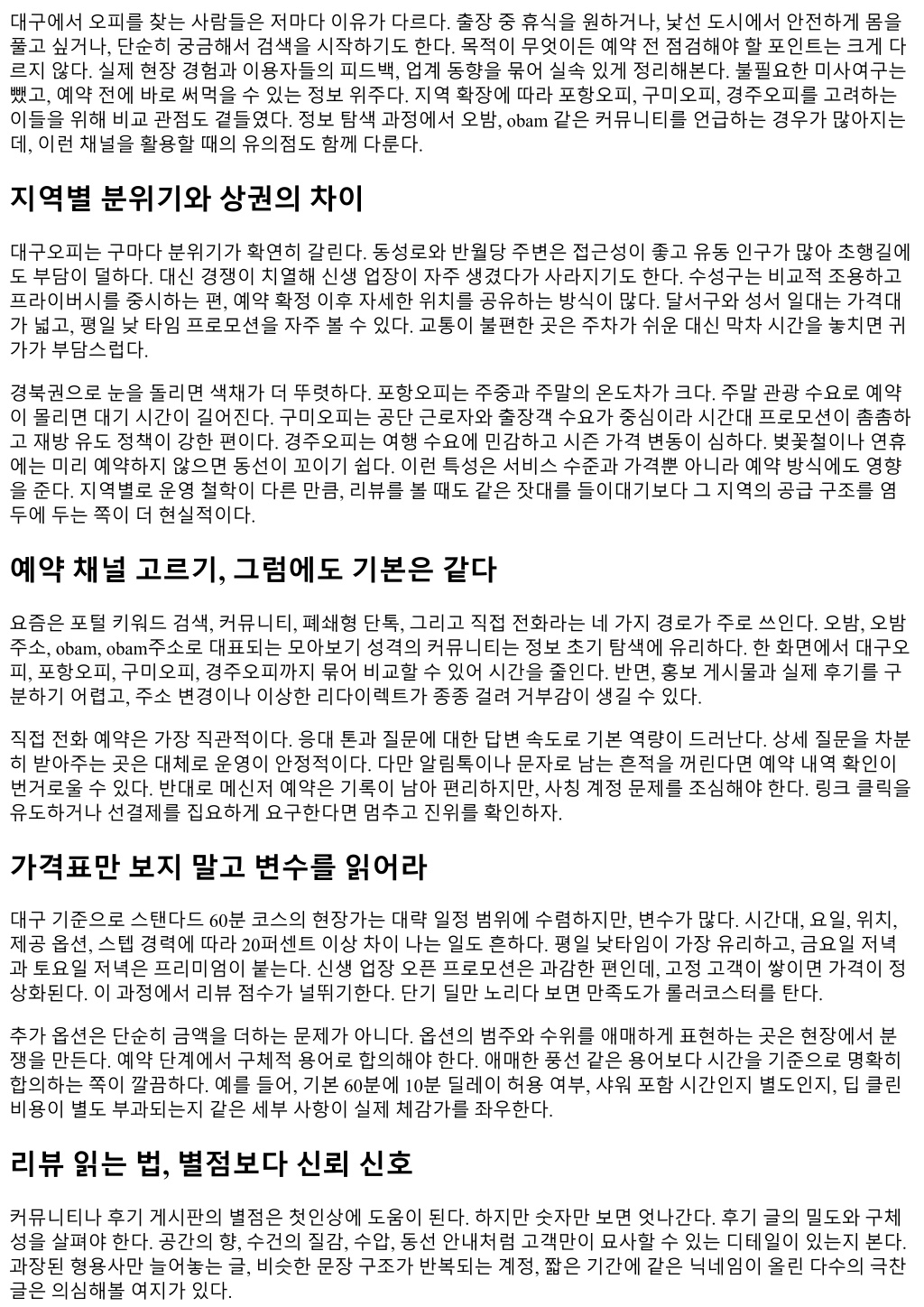 계절팁도있다. 겨울에는난방이지나치게강한곳이있다. 미리온도조절가능여부를확인하자. 여름에는제 습기가없으면샤워후끈적임이남는다. 환기와제습의조합을갖춘곳이드물기때문에, 샤워공간사진과실제 환기창유무를물어보는것만으로도만족도가달라진다. 교통팁으로는, 동성로일대는주차가고난이다. 가능하면외곽공영주차장에세우고도보이동하거나, 지하철 1 호선역세권을활용하자. 반월당에서는출구번호만으로길찾기가꼬이기쉬워, 지상랜드마크기준으로안내 받는것이낫다. 성서공단일대는대형트럭이많아늦은밤보행이불편하다. 차량이동을추천한다. 지역비교, 어디가나와맞을까 대구오피는선택지가넓고, 응대시스템이성숙해있는편이다. 첫이용자에게진입장벽이낮다. 다만경쟁이세 다보니홍보가과격한곳도섞여있다. 포항오피는시즌영향을많이받아예약의운용능력이중요하다. 바다가 가까워숙박과코스를묶어여행동선을짜기좋다. 구미오피는가격과실용성의균형이뛰어나고, 반복이용자 에게특히효율적이다. 경주오피는관광수요의특성상공간의컨셉과프라이버시를내세우는곳이많은데, 그 만큼가격도출렁인다. 어느지역이좋다나쁘다기보다, 각자의일정과성향에맞춰합리적인선택을하는것이 핵심이다. 커뮤니티활용, 오밤과 obam류는도구일뿐 오밤, 오밤주소, obam, obam주소같은커뮤니티는지도와전화번호, 이벤트정보를빠르게모아본다는장점이 있다. 다만주소가자주바뀌는특성상, 즐겨찾기링크만믿고접속하면사설광고페이지나무관한도메인으로 튈수있다. 항상공지게시물의최신날짜를확인하고, 댓글의정정정보까지보자. 특정업장홍보댓글이과하 게붙은글은일단보류하고다른출처와교차검증하자. 익명성이강한공간이니만큼, 정보를소비하는태도가 결과를크게좌우한다. 첫방문시나리오, 이렇게흐르면대체로안전하다 처음예약한다면다음과같은흐름을추천한다. 지역과시간대를정하고, 두세곳을후보로추린다. 각후보에같 은질문을던져응대의결을비교한다. 너무싼가격과과도한약속을내세우는곳은제외한다. 이동동선을구글 맵이나지도앱으로미리시뮬레이션한다. 도착 10분전도착을목표로, 변수가생기면즉시연락한다. 현장에서 동선안내를받으면메모해두고, 약속한시간과옵션이동일한지한번더확인한다. 이용후에는장단점을기록 하고, 과장이섞이지않은피드백을남긴다. 이작은습관이다음선택을쉬워지게만든다. 자주겪는오해와해결법 업계에서반복적으로발생하는오해몇가지가있다. 예약시간이 60분이라고해서, 모든서비스가 60분꽉차게 제공된다고믿는경우다. 샤워, 준비, 정리시간이포함되는지미리확인해야한다. 사진과실물이다르다며현장