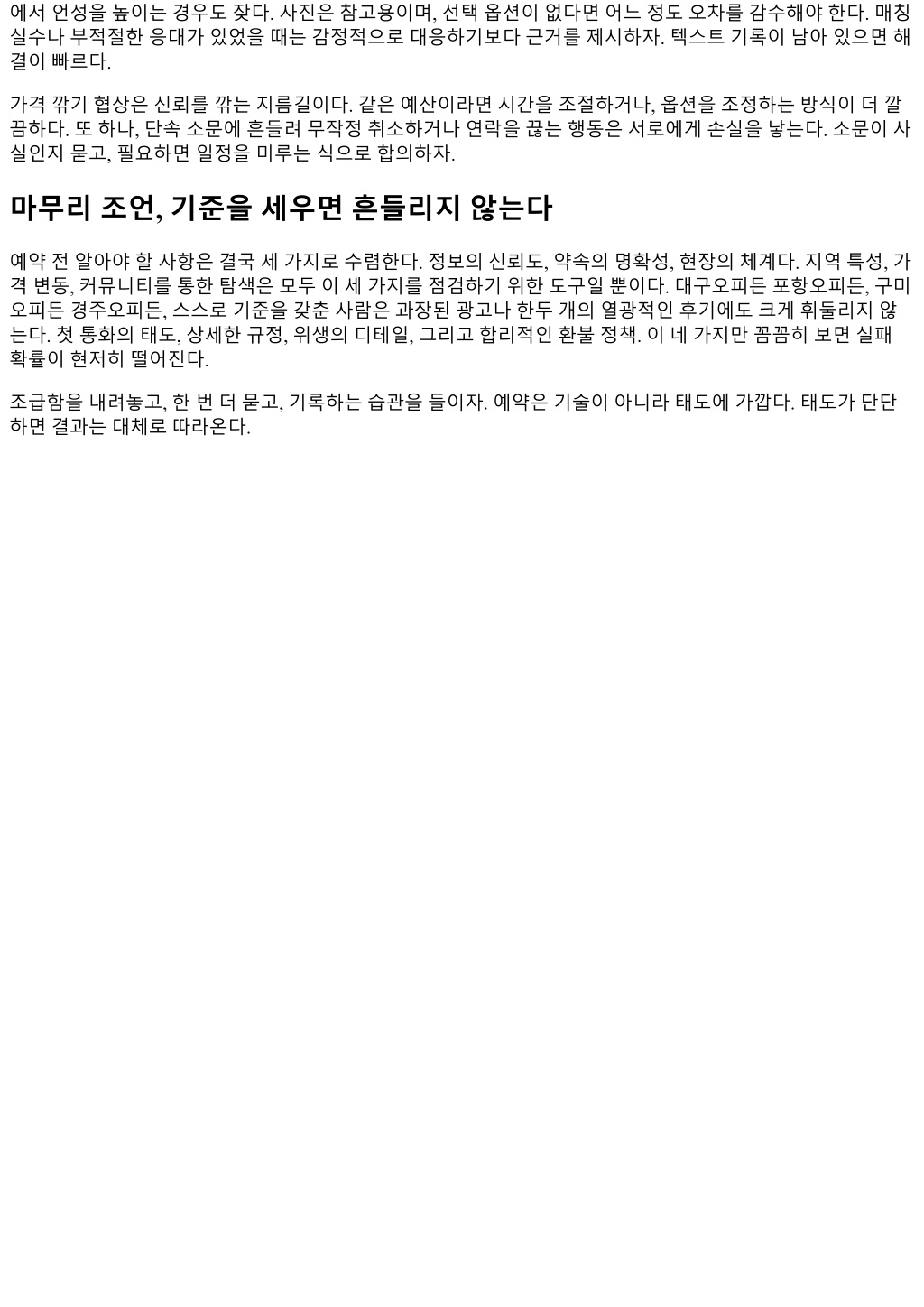 에서언성을높이는경우도잦다. 사진은참고용이며, 선택옵션이없다면어느정도오차를감수해야한다. 매칭 실수나부적절한응대가있었을때는감정적으로대응하기보다근거를제시하자. 텍스트기록이남아있으면해 결이빠르다. 가격깎기협상은신뢰를깎는지름길이다. 같은예산이라면시간을조절하거나, 옵션을조정하는방식이더깔 끔하다. 또하나, 단속소문에흔들려무작정취소하거나연락을끊는행동은서로에게손실을낳는다. 소문이사 실인지묻고, 필요하면일정을미루는식으로합의하자. 마무리조언, 기준을세우면흔들리지않는다 예약전알아야할사항은결국세가지로수렴한다. 정보의신뢰도, 약속의명확성, 현장의체계다. 지역특성, 가 격변동, 커뮤니티를통한탐색은모두이세가지를점검하기위한도구일뿐이다. 대구오피든포항오피든, 구미 오피든경주오피든, 스스로기준을갖춘사람은과장된광고나한두개의열광적인후기에도크게휘둘리지않 는다. 첫통화의태도, 상세한규정, 위생의디테일, 그리고합리적인환불정책. 이네가지만꼼꼼히보면실패 확률이현저히떨어진다. 조급함을내려놓고, 한번더묻고, 기록하는습관을들이자. 예약은기술이아니라태도에가깝다. 태도가단단 하면결과는대체로따라온다.