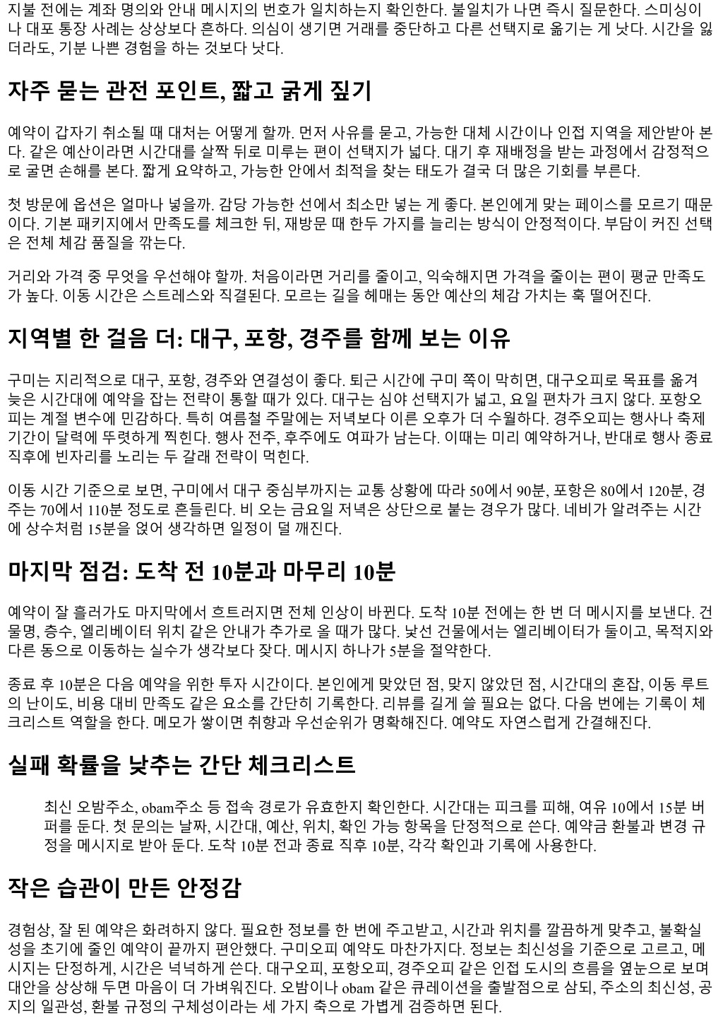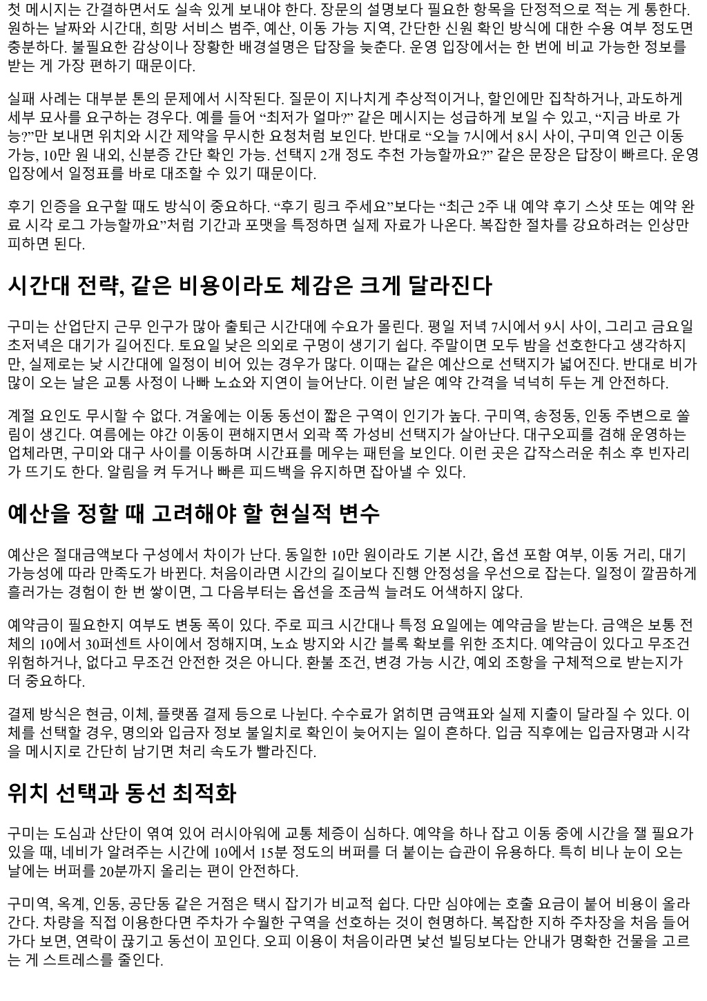 기술적으로어려운요령은없다. 대신반복해서통하는몇가지습관이있다. 첫메시지를완성도있게보내는습 관, 도착전짧은확인을빼먹지않는습관, 일정이틀어질때감정보다선택지를먼저떠올리는습관. 이세가지 만들이면, 예약성공률은빠르게오른다. 처음의낯섦이사라지고, 구미에서의저녁도한결부드러워진다.