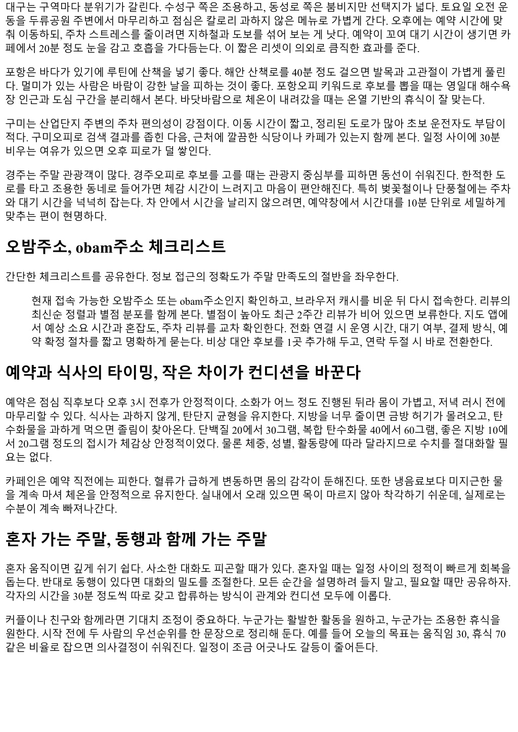 점심이후 15에서 20분의산책이혈당변동을부드럽게만든다. 빠르게걷지않아도된다. 발목과고관절을가볍 게열면서대화를삼가고호흡만고른다. 산책뒤에짧은낮잠을붙이면금상첨화다. 단 15분이면충분하고, 25분 을넘기면기상후멍해질수있다. 알람은소리보다진동이낫다. 베개를높이지말고얇은수건하나로목선을 받치면어깨가편하다. 일요일, 정리와예열 일요일은정리의날이다. 토요일에잘쉬었다면몸이가벼울것이고, 토요일에과했다면일요일에조절해야한 다. 아침에 10분정도의가벼운스트레칭으로몸을깨우고, 브런치에탄수화물을너무올리지않는다. 오밤에서 다음주말의후보를한두개만저장해둔다. 예약까지미리당기지않는다. 예열이과하면기대치가현실을압도 한다. 오후에는장보기와빨래, 월요일아침도시락또는간단한간식을준비한다. 미래의나에게선물을주는시 간이다. 한주간의장면이스쳐갈때가있다. 이럴때는휴대전화의메모앱을열고, 이번주말의좋았던점 3가지, 아쉬 웠던점 1가지를기록한다. 이렇게쌓인기록이다음주말의의사결정을굉장히날렵하게만든다. 취향은어느 날갑자기생기지않는다. 반복과작은조정으로천천히만들어진다. 예산과시간, 현실의제약안에서최대화하기 아이를돌보거나부모님을챙겨야하는상황, 교대근무나프리랜서의불규칙한스케줄같은현실이있다. 그래 서완벽한주말은드물다. 가능한범위에서최선의조합을찾으면된다. 이동시간을 40분이내로제한하고, 예약 과예약사이에 20분의회복시간을끼워넣자. 주차대신도보와대중교통을섞으면이동중에가벼운명상이가 능하다. 귀가시간을스스로와약속하고, 그약속을지켜본다. 반복하면자신감이생긴다. 초보를위한간단루트예시 대구기준: 토요일오전두류공원산책 30분, 점심은담백한국수나비빔밥, 오후 3시전후예약, 카페에서 15분낮잠, 이른저녁집밥으로마무리. 포항기준: 영일대산책 40분, 바닷바람이강하면바람막이를챙김, 오후에는온열기반휴식, 저녁엔가벼운해산물과흰밥소량. 구미기준: 주차편한곳에차를두고도보이 동, 오후 2시대예약, 회복음료로미지근한물과과일, 저녁에는일찍귀가. 경주기준: 관광지혼잡시간대 를피하고이른오후타임으로이동, 역사유적지주변산책 20분, 저녁러시전에귀가. 이루트는어디까지나예시다. 핵심은내생활권과컨디션에맞춰비율을조정하는것이다. 오밤이나 obam에서 확보한정보는도구일뿐, 주인공은내몸과시간이다. 마무리, 평범한주말의힘 잘설계된주말은평범하지만강하다. 대단한이벤트가없어도월요일의어깨가가볍다. 오밤주소, obam주소를 시작점으로삼되, 정보의파도에휩쓸리지않는연습을하면주말이단단해진다. 대구오피, 포항오피, 구미오피, 경주오피같은지역별키워드는효율을높여주지만, 결국만족을결정하는건사소한디테일이다. 물온도, 산책 의속도, 낮잠의길이, 귀가시간, 화면을덮는타이밍같은작은선택들이하루의질을바꾼다. 주말힐링플랜은완성본이없다. 한주씩돌려보며나에게맞는비율을찾아가자. 기대를낮추는게아니라, 기 대를현실에정확히맞추는일이다. 그정확함이주말을빛나게한다.