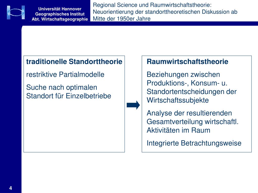 Regional Science und Raumwirtschaftstheorie:Neuorientierung der standorttheoretischen Diskussion ab Mitte der 1950er Jahre traditionelle Standorttheorie restriktive Partialmodelle Suche nach optimalen Standort für Einzelbetriebe Raumwirtschaftstheorie Beziehungen zwischen Produktions-, Konsum- u. Standortentscheidungen der Wirtschaftssubjekte Analyse der resultierenden Gesamtverteilung wirtschaftl. Aktivitäten im Raum Integrierte Betrachtungsweise
