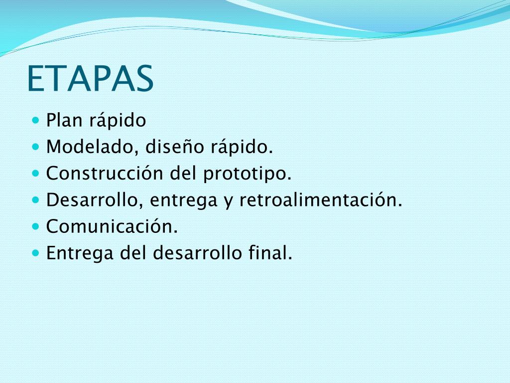 ETAPAS • Plan rápido • Modelado, diseño rápido. • Construcción del prototipo. • Desarrollo, entrega y retroalimentación. • Comunicación. • Entrega del desarrollo final.