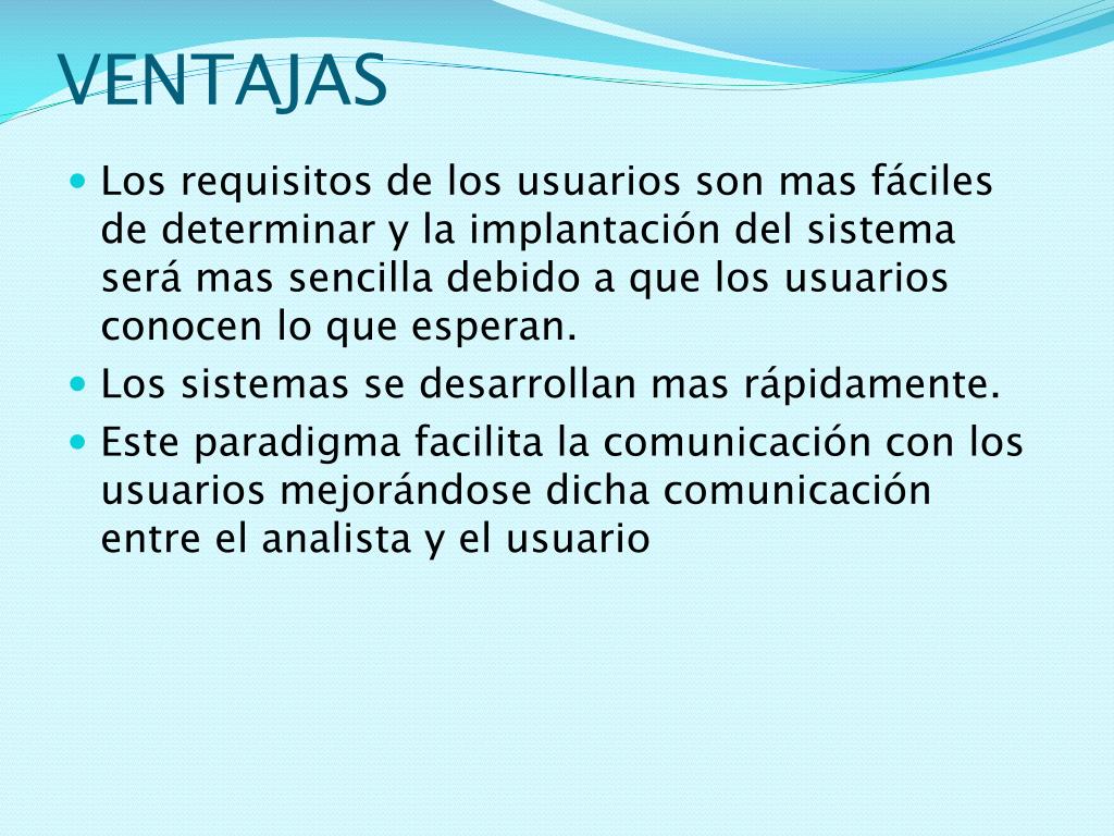 VENTAJAS • Los requisitos de los usuarios son mas fáciles de determinar y la implantación del sistema será mas sencilla debido a que los usuarios conocen lo que esperan. • Los sistemas se desarrollan mas rápidamente. • Este paradigma facilita la comunicación con los usuarios mejorándose dicha comunicación entre el analista y el usuario