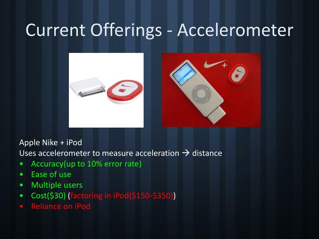 Current Offerings - Accelerometer Apple Nike + iPod Uses accelerometer to measure acceleration distance • Accuracy(up to 10% error rate) • Ease of use • Multiple users • Cost($30) (factoring in iPod($150-$350)) • Reliance on iPod
