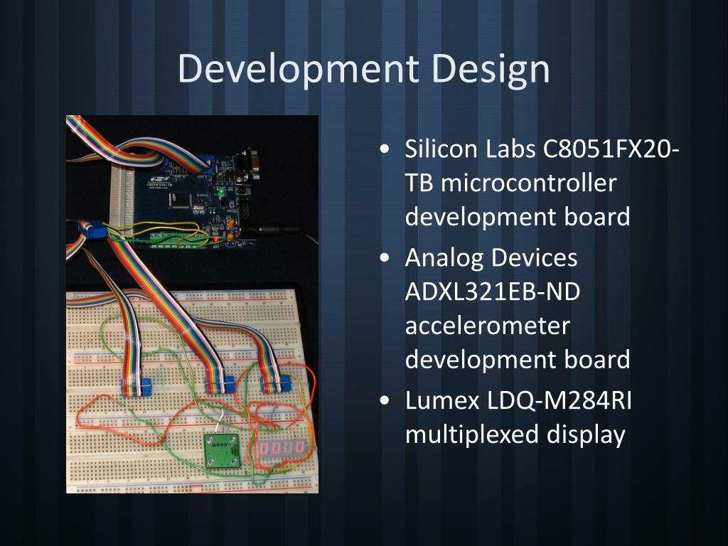 Development Design • Silicon Labs C8051FX20-TB microcontroller development board • Analog Devices ADXL321EB-ND accelerometer development board • Lumex LDQ-M284RI multiplexed display