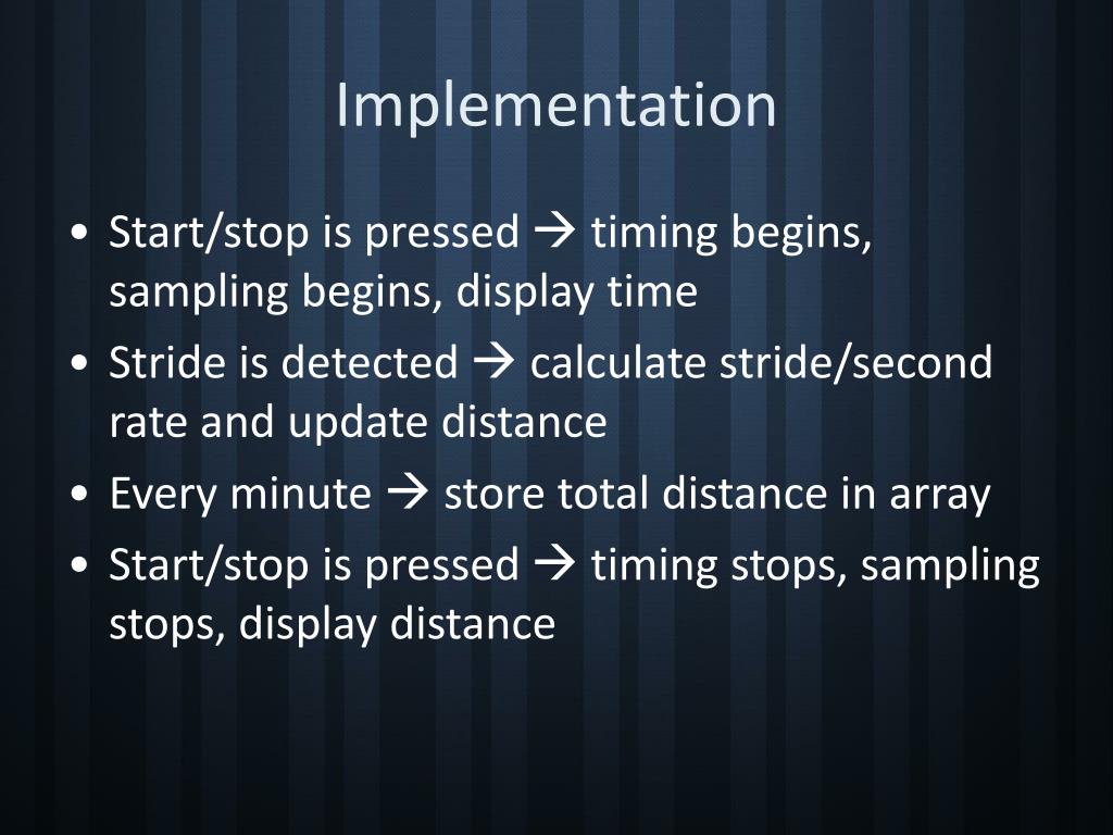 Implementation • Start/stop is pressed timing begins, sampling begins, display time • Stride is detected calculate stride/second rate and update distance • Every minute store total distance in array • Start/stop is pressed timing stops, sampling stops, display distance