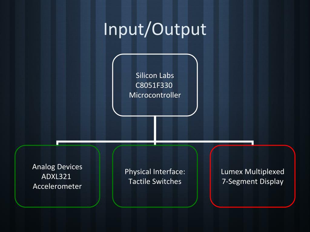 Design Choices • 2-axis vs. 3-axis accelerometer - no need for z-axis measurements • Microcontroller (C8051F330) - small form factor - ADC - adequate RAM - sufficient I/O pins