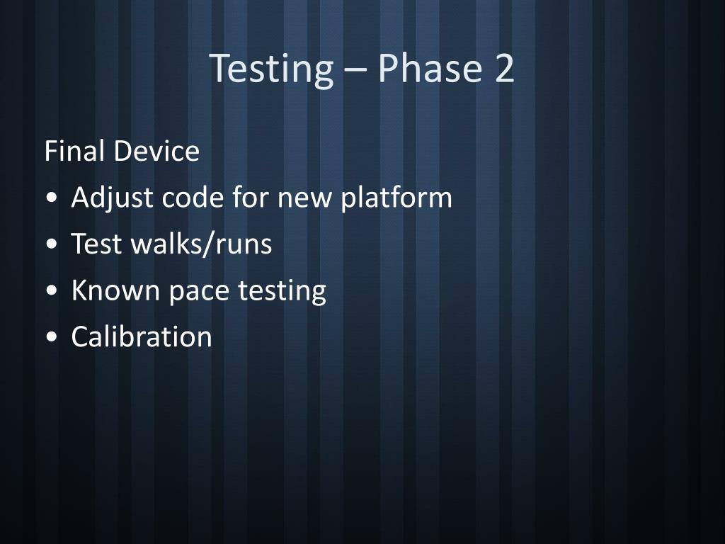 Testing – Phase 2 Final Device • Adjust code for new platform • Test walks/runs • Known pace testing • Calibration