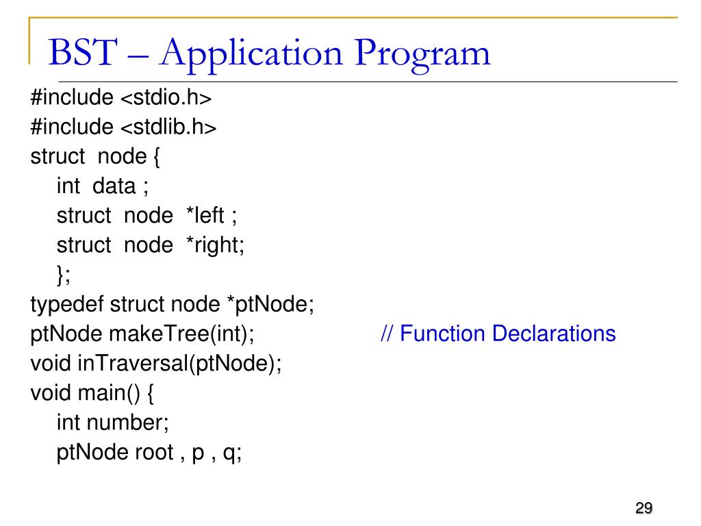 BST – Application Program #include <stdio.h> #include <stdlib.h> struct node { int data ; struct node *left ; struct node *right; }; typedefstruct node *ptNode; ptNodemakeTree(int); // Function Declarations void inTraversal(ptNode); void main() { int number; ptNode root , p , q;