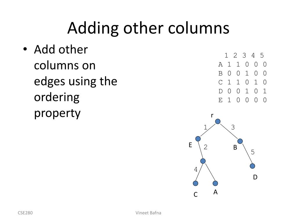 Adding other columns 1 2 3 4 5 A 1 1 0 0 0 B 0 0 1 0 0 C 1 1 0 1 0 D 0 0 1 0 1 E 1 0 0 0 0 • Add other columns on edges using the ordering property r 1 3 E 2 B 5 4 D A C Vineet Bafna