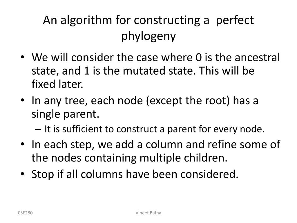 An algorithm for constructing a perfect phylogeny • We will consider the case where 0 is the ancestral state, and 1 is the mutated state. This will be fixed later. • In any tree, each node (except the root) has a single parent. • It is sufficient to construct a parent for every node. • In each step, we add a column and refine some of the nodes containing multiple children. • Stop if all columns have been considered. Vineet Bafna