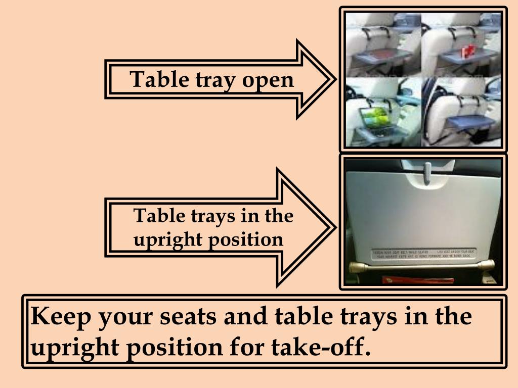 Table tray open Table trays in the upright position Keep your seats and table trays in the upright position for take-off.
