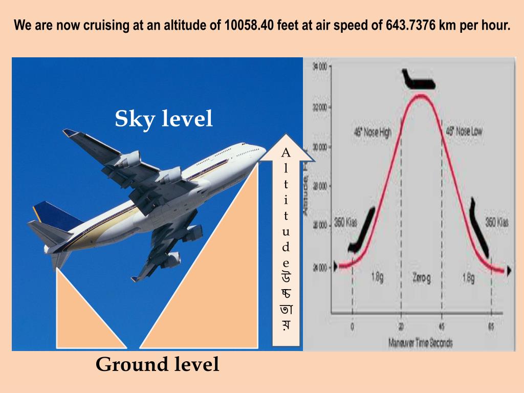 We are now cruising at an altitude of 10058.40 feet at air speed of 643.7376 km per hour. Sky level A l t i t u d e উ চ্চ তা য় Ground level