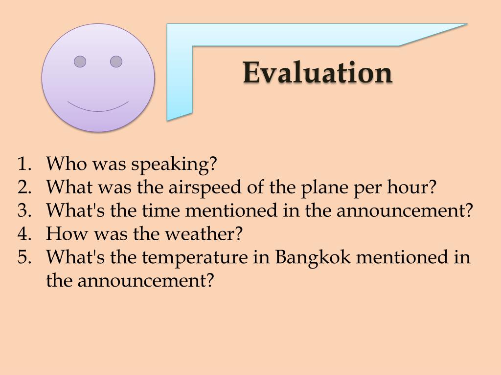 Evaluation • Who was speaking? • What was the airspeed of the plane per hour? • What's the time mentioned in the announcement? • How was the weather? • What's the temperature in Bangkok mentioned in the announcement?