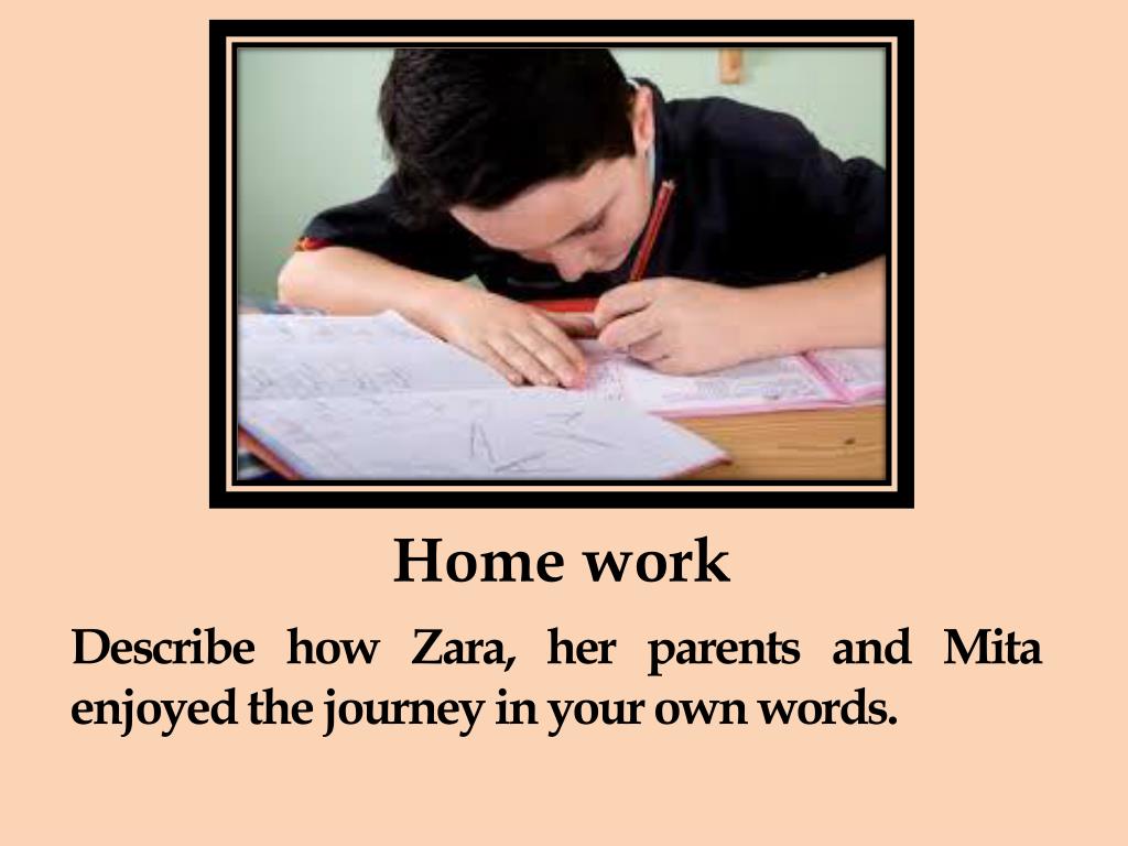 Home work Describe how Zara, her parents and Mita enjoyed the journey in your own words.