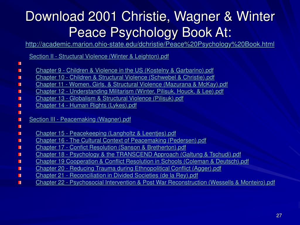 Download 2001 Christie, Wagner & Winter Peace Psychology Book At:http://academic.marion.ohio-state.edu/dchristie/Peace%20Psychology%20Book.html Table of Contents.pdf • Foreword (M. Brewster Smith).pdf • Preface (Christie, Wagner, & Winter).pdf • Introduction to Peace Psychology (Christie, Wagner, & Winter).pdf • Section I - Direct Violence (Wagner).pdf • Chapter 1 - Intimate Violence (Abrahams).pdf • Chapter 2 - Anti Gay & Lesbian Violence (Cody Murphy).pdf • Chapter 3 - Intrastate Violence (Niens & Cairns).pdf • Chapter 4 - Nationalism & War (Druckman).pdf • Chapter 5 - Integrative Complexity & War & Peace (Conway, Suedfeld, & Tetlock).pdf • Chapter 6 - Genocide and Mass Killing (Staub).pdf • Chapter 7 - Weapons of Mass Destruction (Britton).pdf • Chapter 8 - Social Injustice (Opotow).pdf